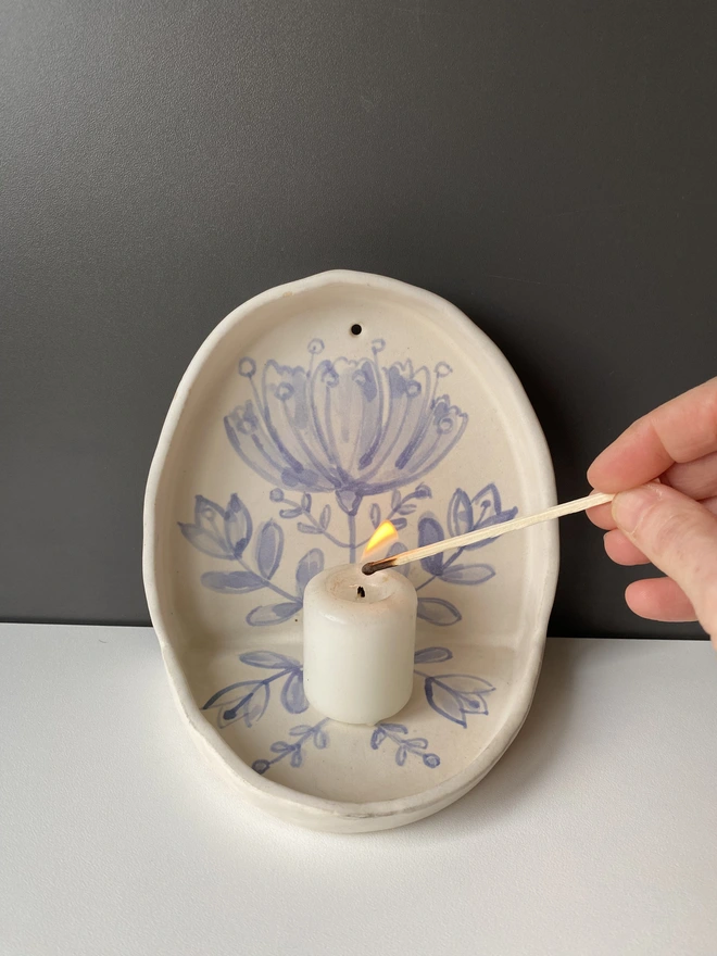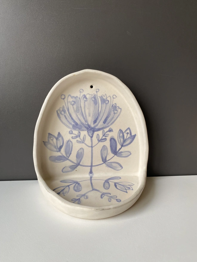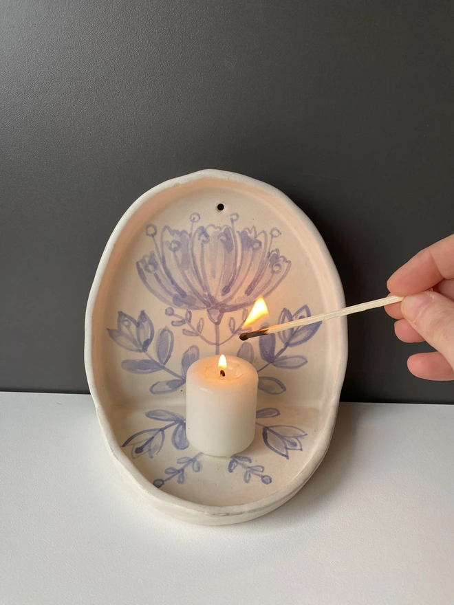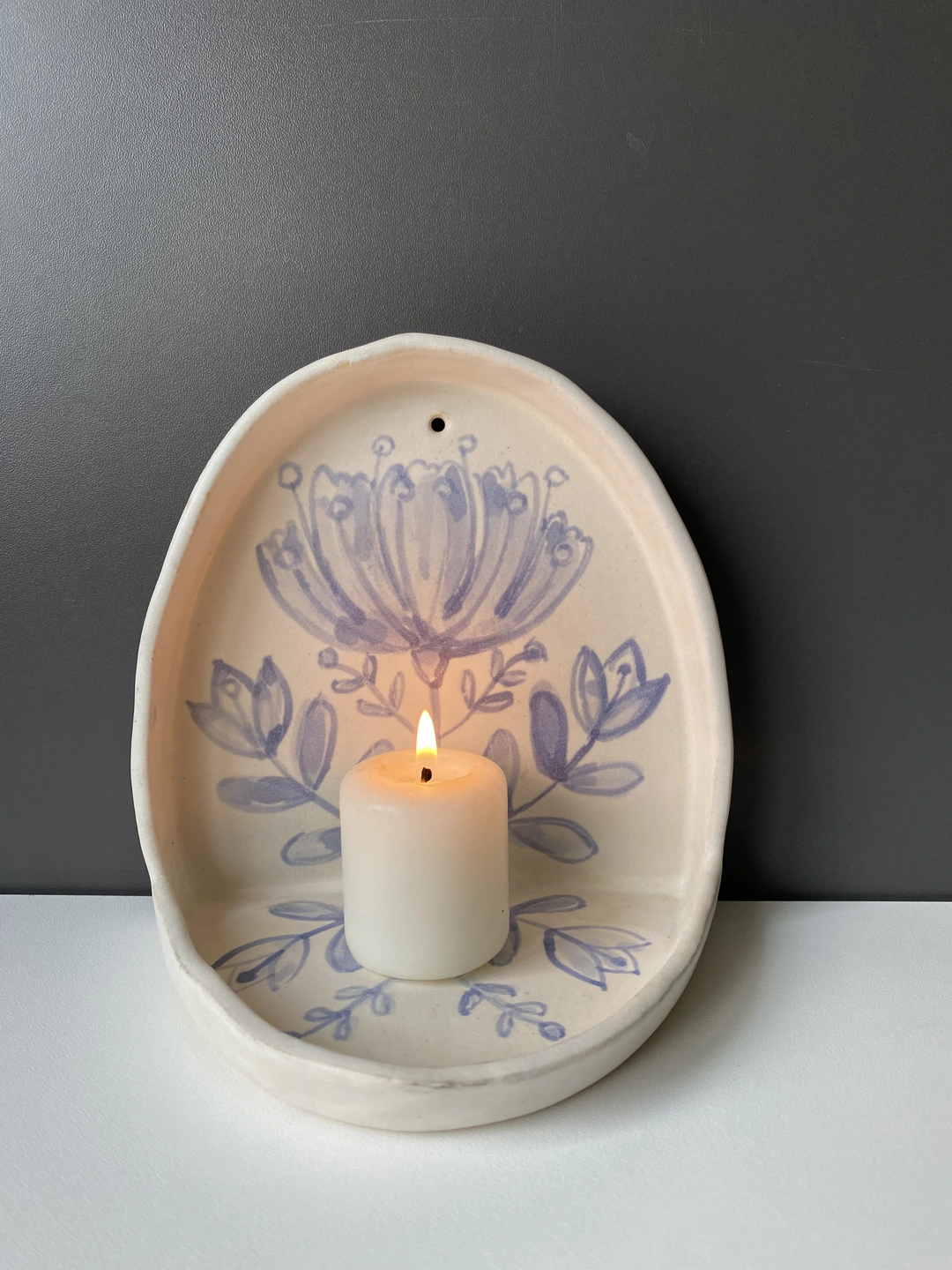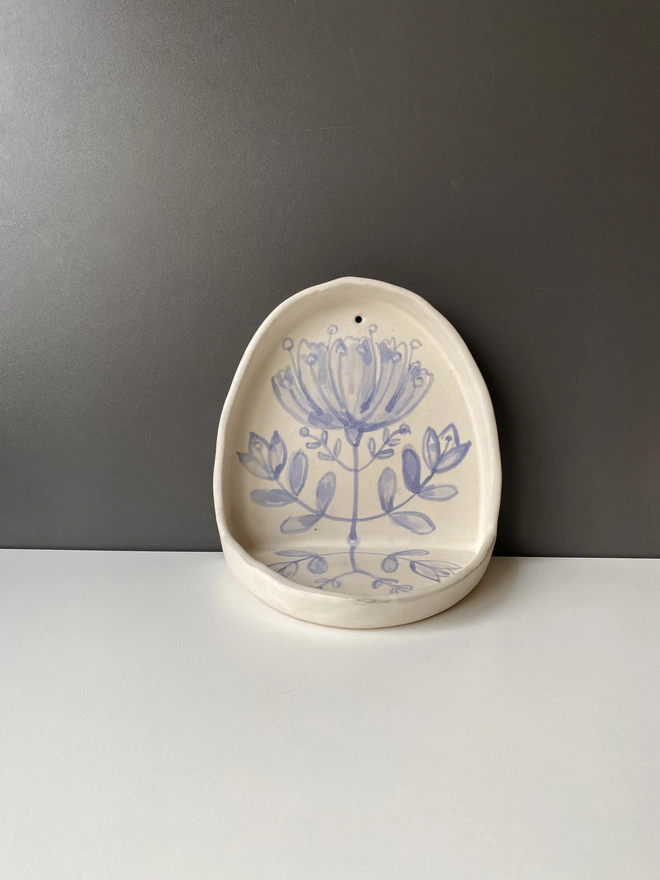 Lovely wall or shelf candle holder, with hand painted flower design. Hand built with a white stoneware clay and decorated with blue underglaze. Fired to bisque and then glazed with a soft semi transparent soft creamy white glaze.
