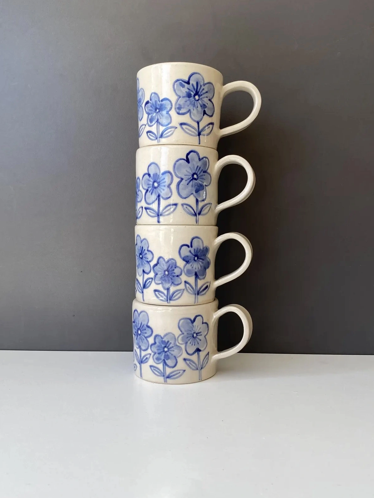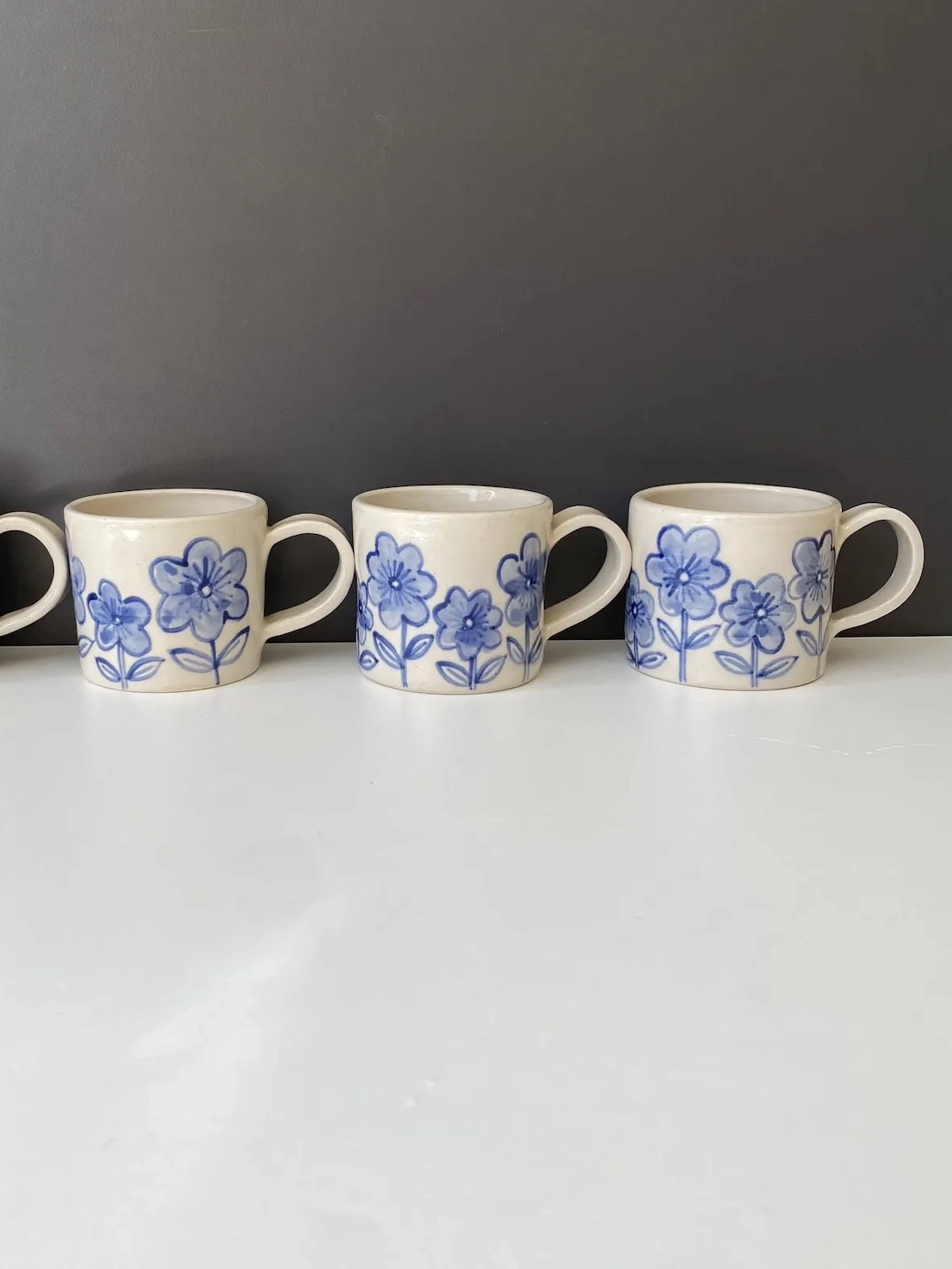 Lovely handmade wheel thrown espresso mugs, perfect size for affogato too! Inspired by a blue and white delft ware and sixties flower design.