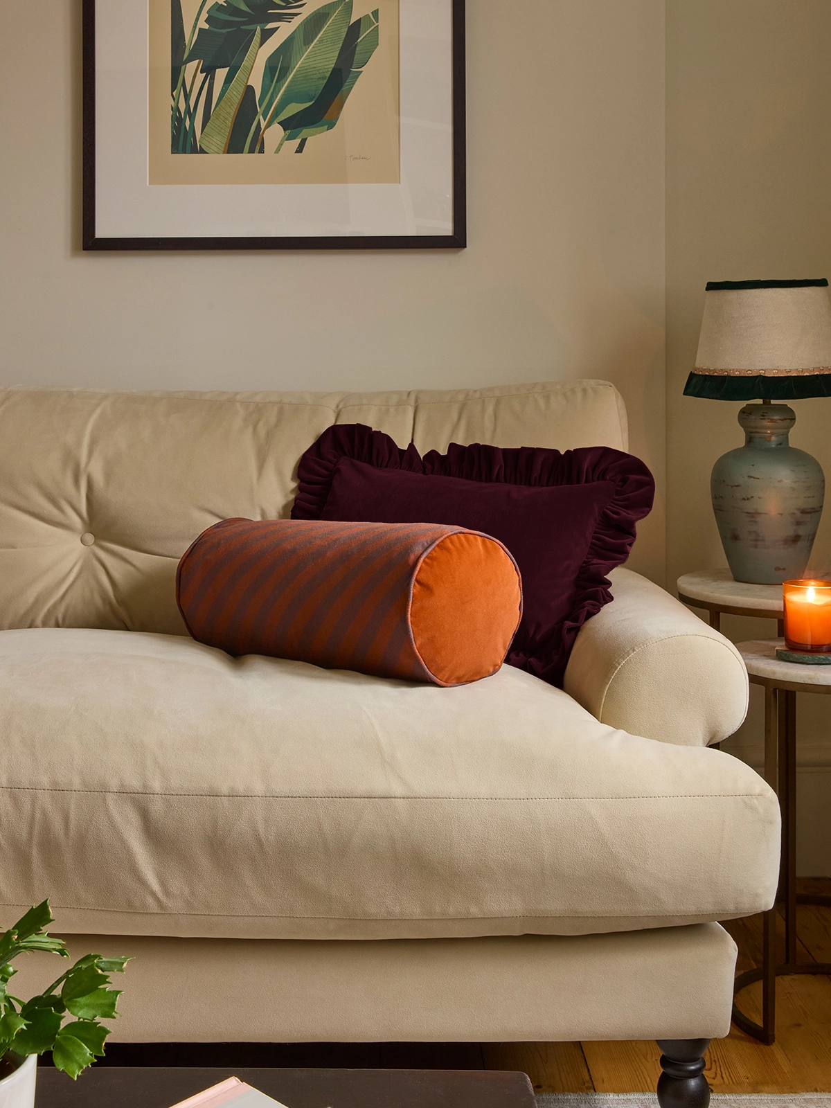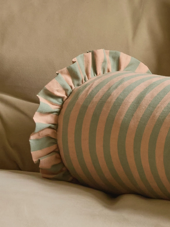 The pale jade and sand stripe has a gathered ruffle at both ends — soft, considered and the colour combination that makes a room feel like it has been thought about. Pairs beautifully with our pure linen pale jade cushion with rust piping — available as a separate listing.