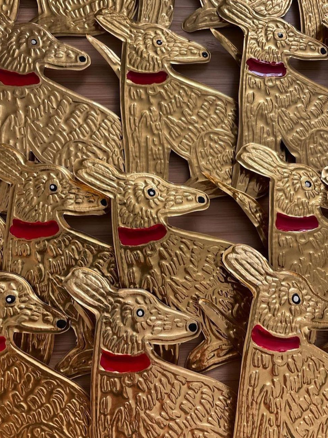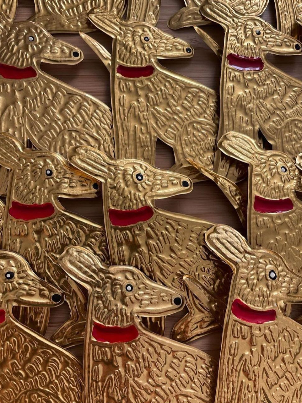 A delicate handmade golden tin decoration with hand-painted enamel details.