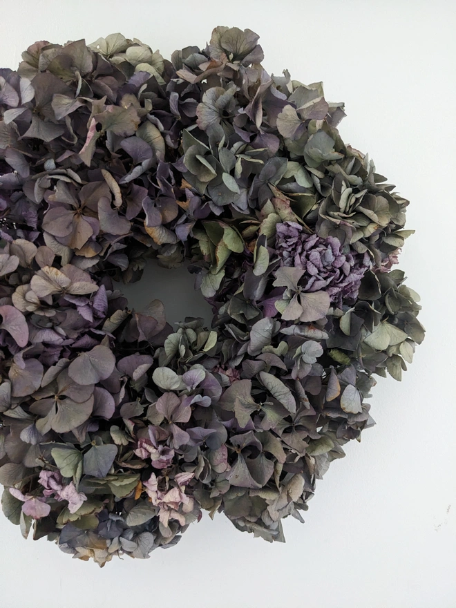 A delicate handmade wreath crafted from dried hydrangeas. Measuring approximately 30cm in diameter, each bloom is grown and naturally dried in West Sussex, bringing gentle colour and texture to your home.