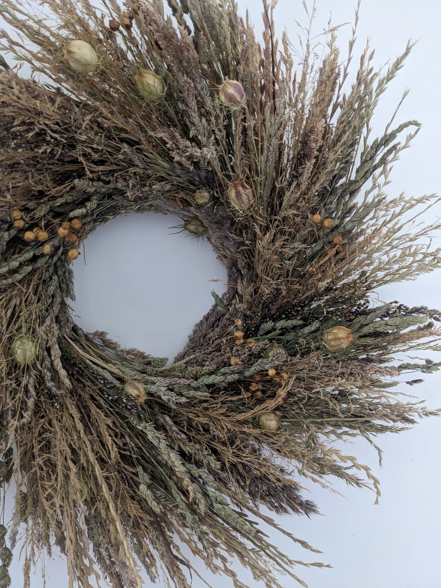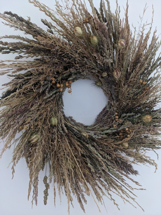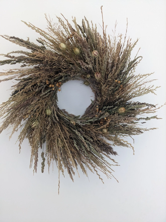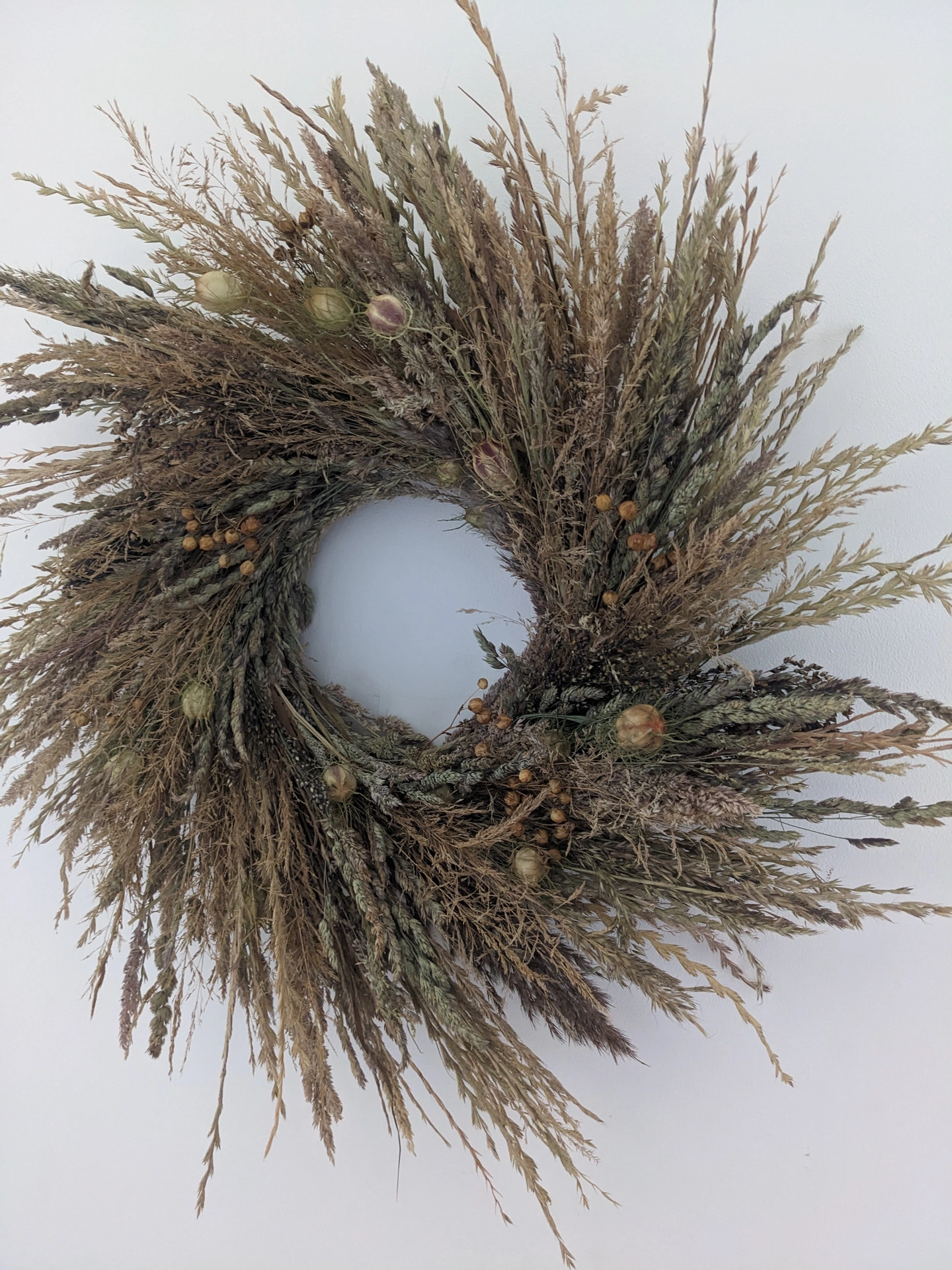 Bring the calm beauty of the countryside into your home with this handcrafted foraged wreath. Featuring soft, neutral tones and a delicate blend of naturally dried grasses, cow parsley seed pods, and a touch of nigella, this piece adds quiet charm and texture to any space. Perfect for rustic interiors, nature lovers, or as a unique gift, each wreath is one of a kind, sustainably made with seasonal finds.