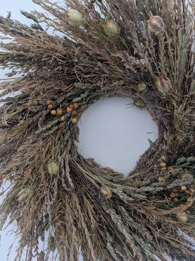 Bring the calm beauty of the countryside into your home with this handcrafted foraged wreath. Featuring soft, neutral tones and a delicate blend of naturally dried grasses, cow parsley seed pods, and a touch of nigella, this piece adds quiet charm and tex...