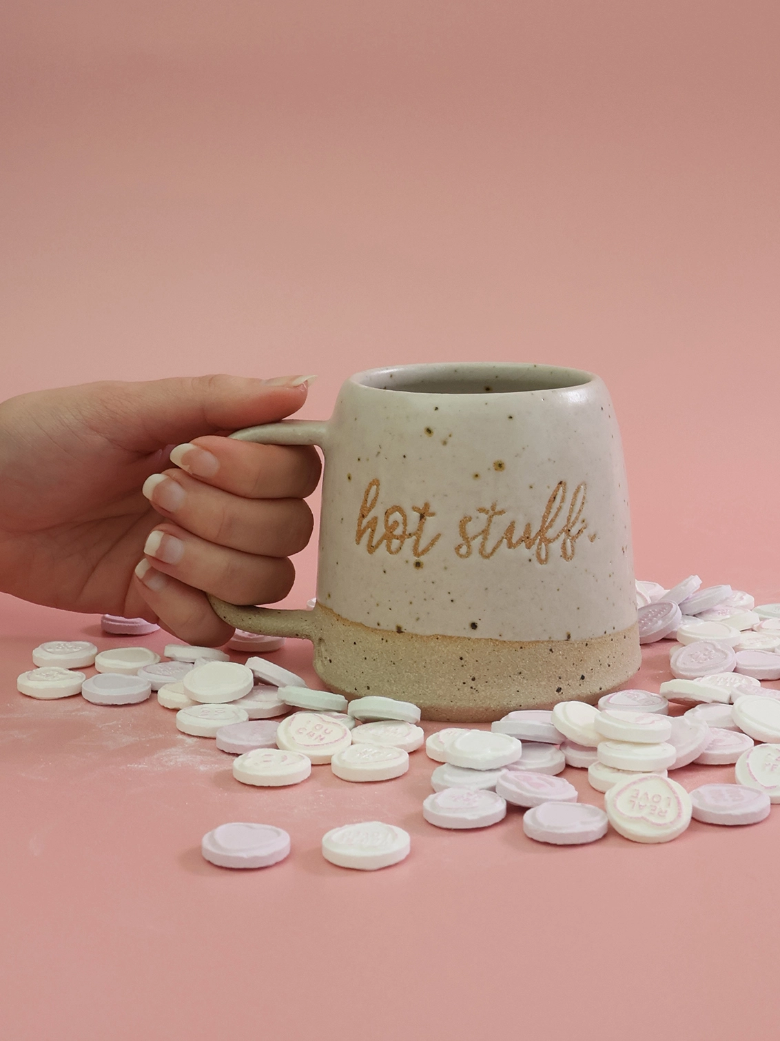 Thrown using speckled stoneware clay, each handmade mug is finished with a soft, calming glaze that allows the exposed clay Hot Stuff text to stand out beautifully. Available in fuchsia or our signature off-white, this handmade ceramic mug offers a gentle pop of colour while keeping an earthy, rustic-contemporary feel.