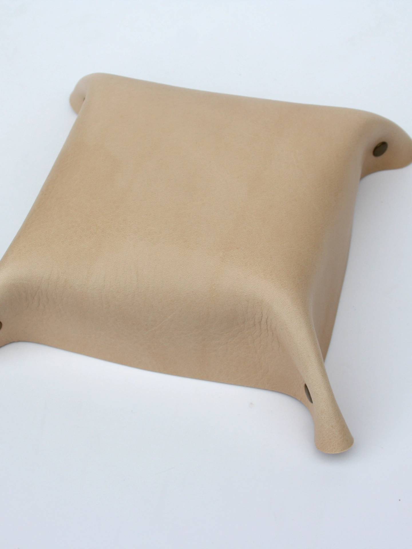 Hand cut from Italian Veg Tan leather which we then hand dye in our workshop to the colour of your choice. Each tray is made to order so please note yours may differ slightly in colour and finish to those shown in the images. The dye helps show off the beautiful natural patina of the leather we use, which has creases, slight blemishes and marks. All trays are made with a matching coloured base and stitched in complimentary thread to the colour chosen.