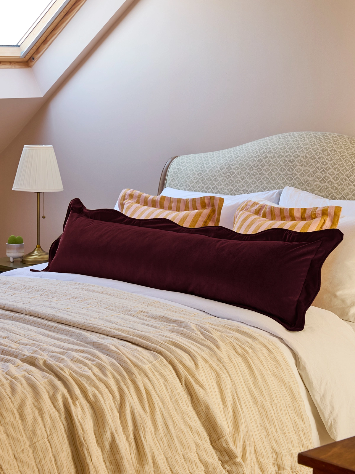 At 130cm wide and 35cm deep, our scalloped velvet bolster is the piece that changes a bedroom. Not a finishing touch — a statement. The kind of thing you spot in a boutique hotel and immediately photograph.