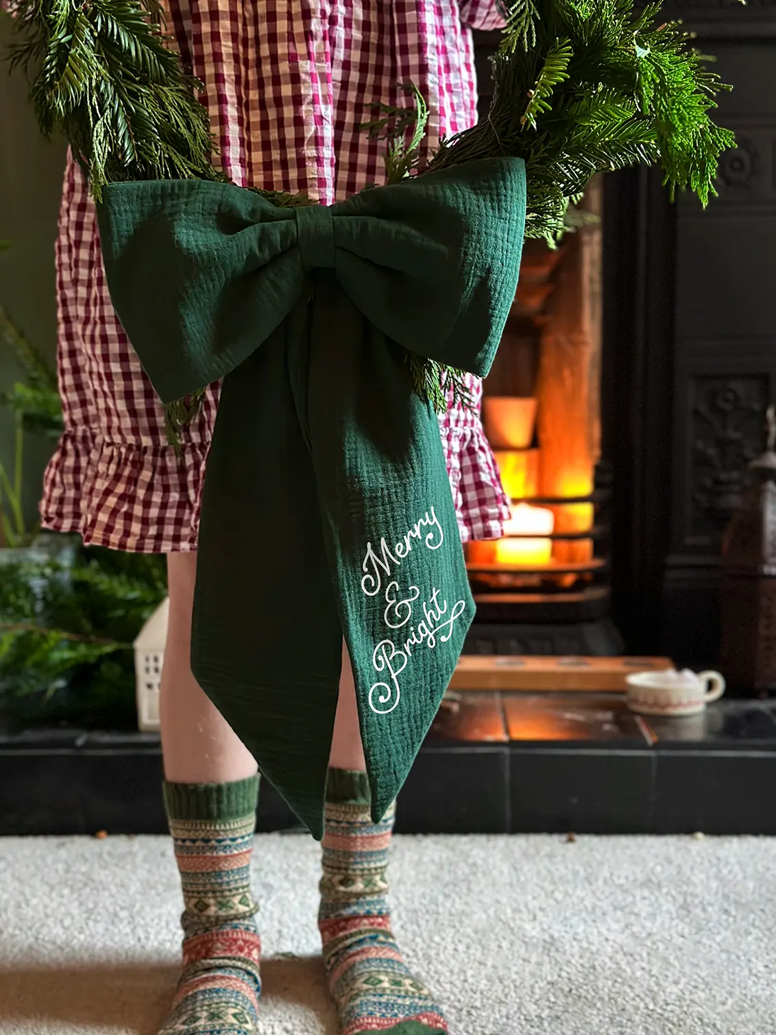 Handmade with love from the softest deep burgundy cotton, this oversized bow with ‘Merry & Bright’ wording on one tail, is the perfect heirloom Christmas decoration, full of magic and heart.
