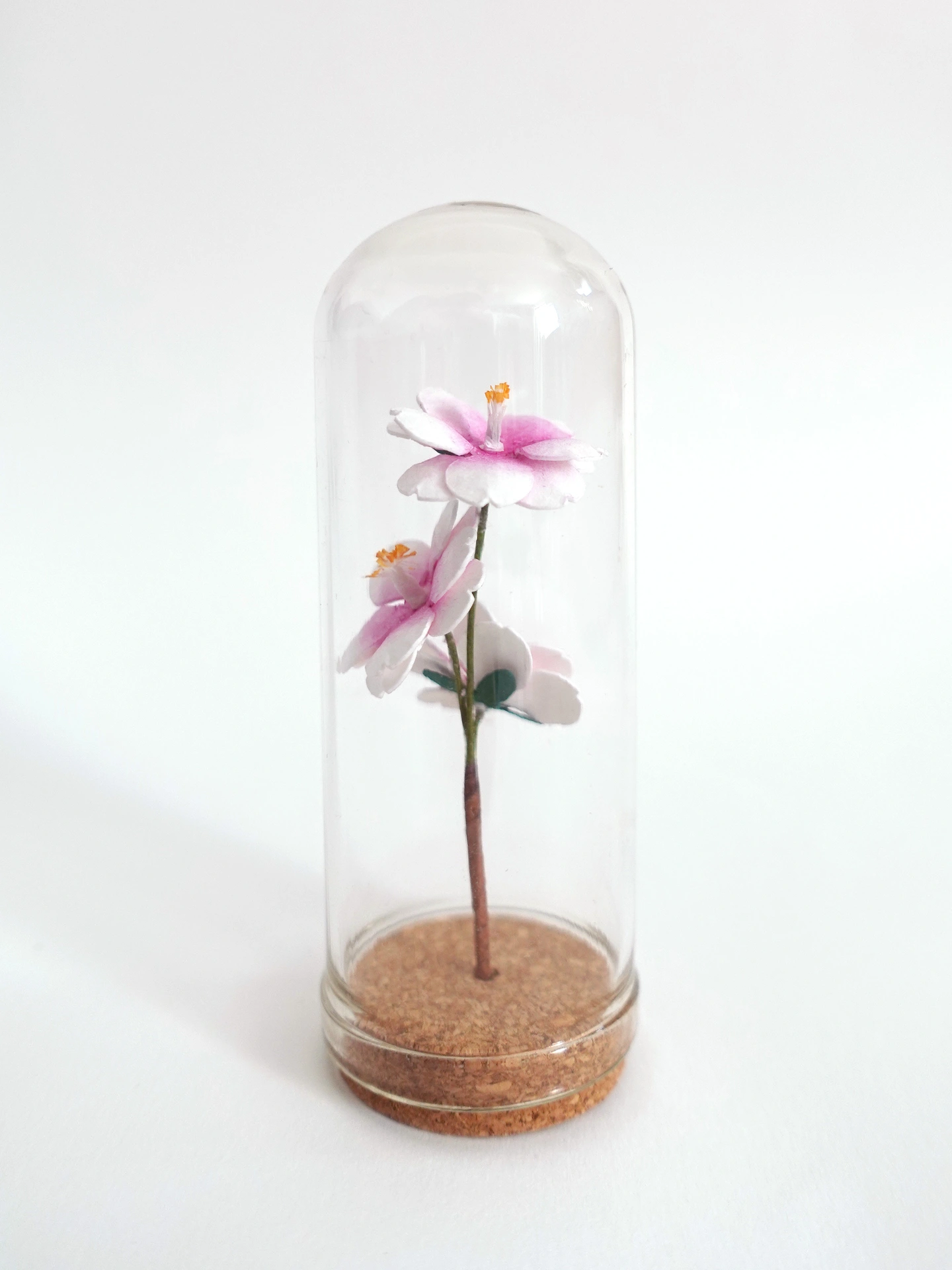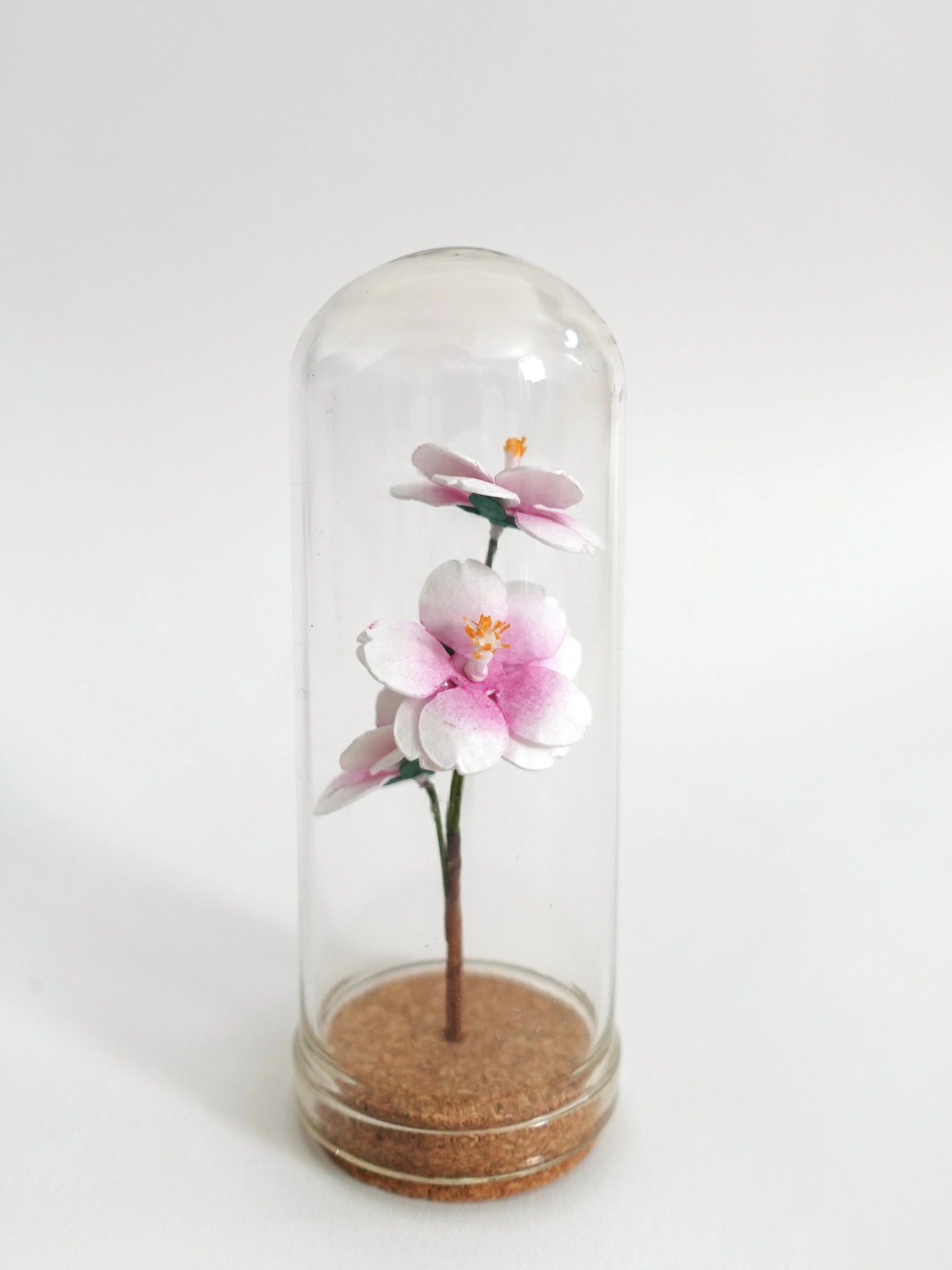 1 Handmade Mini Cherry Blossoms in a glass dome inspired by our original Crepe Paper Flower ! It is hand painted on card stock paper. It is a perfect small decoration for Home & Offices. And they will last forever without any extra care !