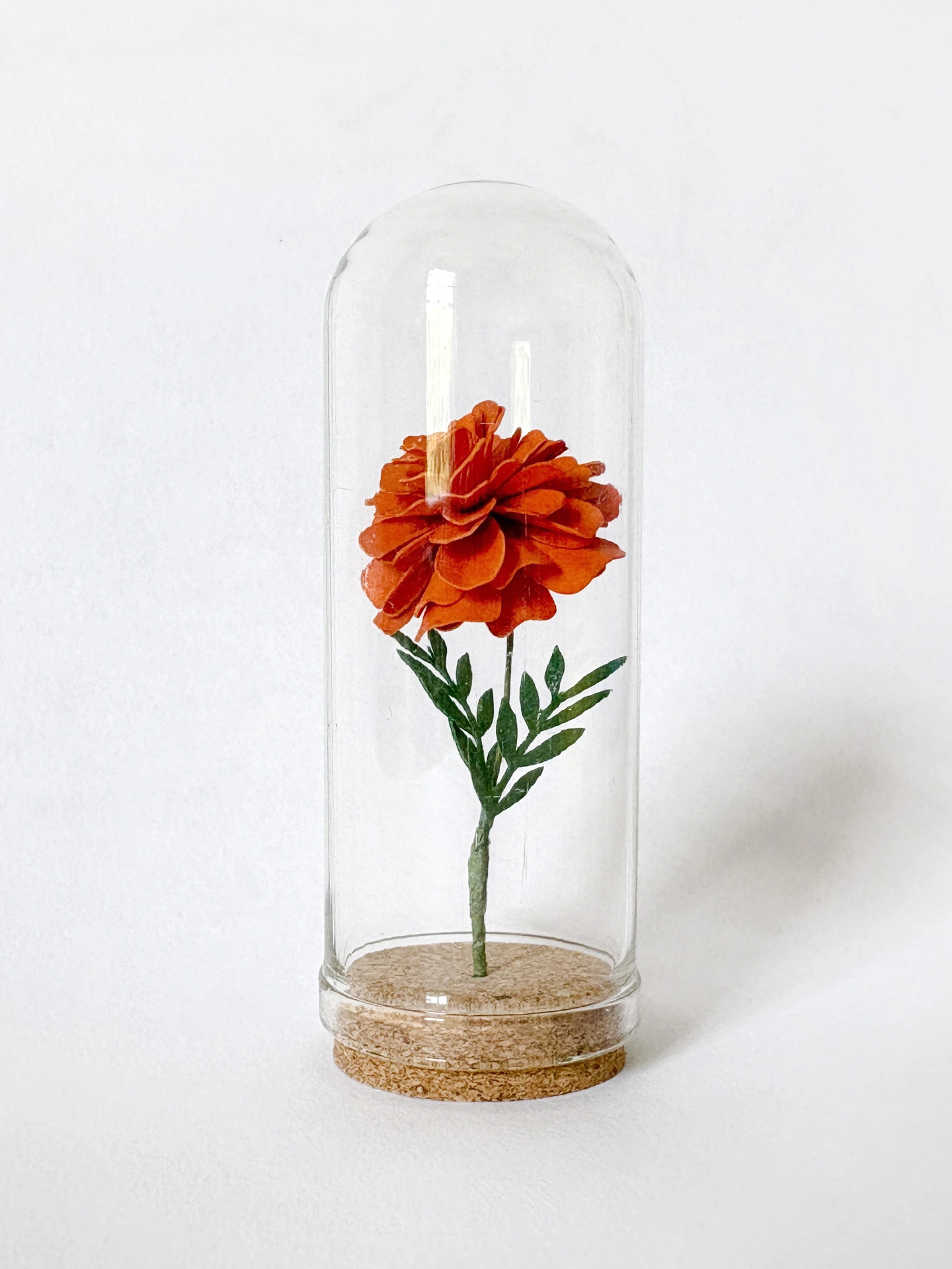 1 Handmade Mini Marigold branch in a glass dome inspired by our original Crepe Paper Flower ! It is hand painted on card stock paper. It is a perfect small decoration for Home & Offices. And they will last forever without any extra care !...