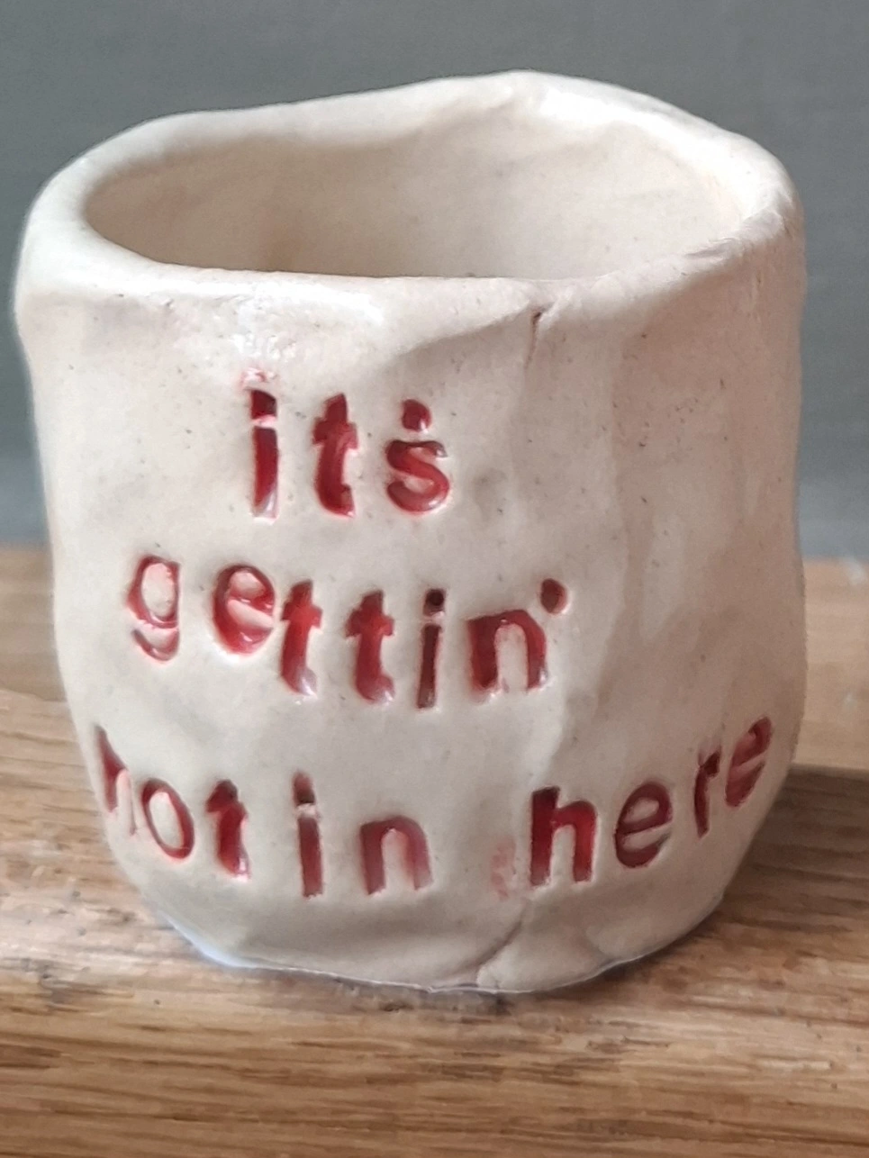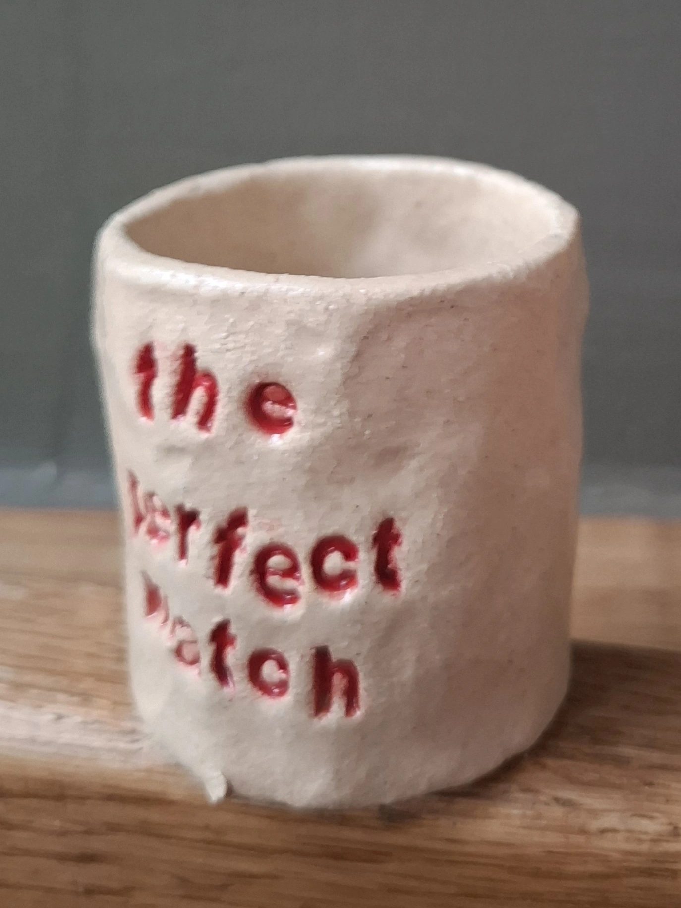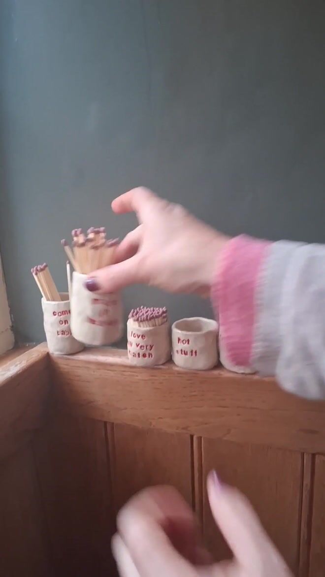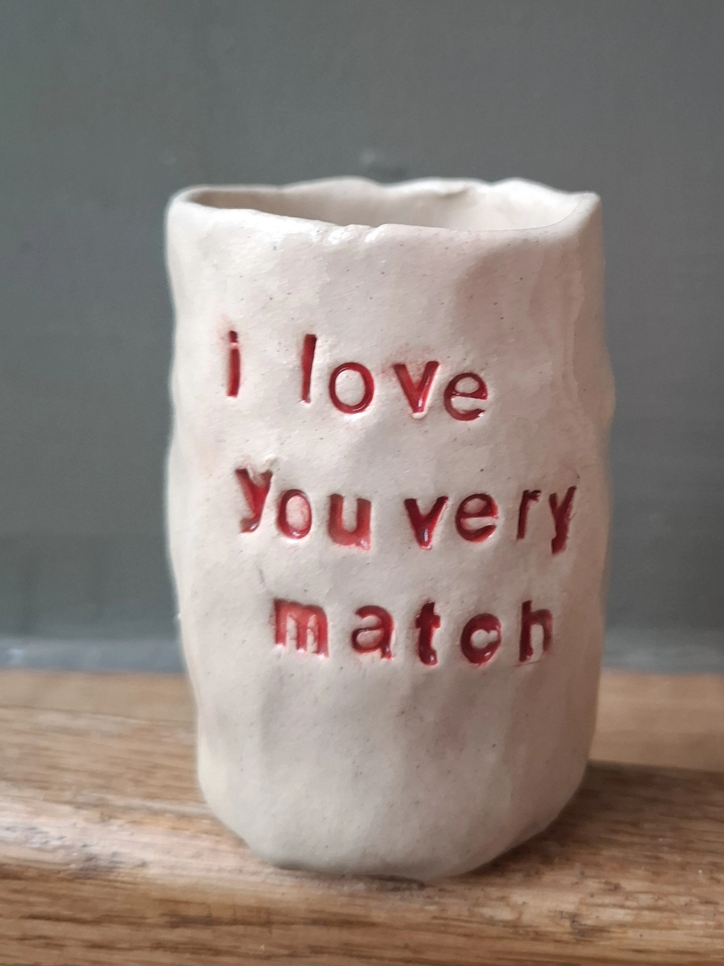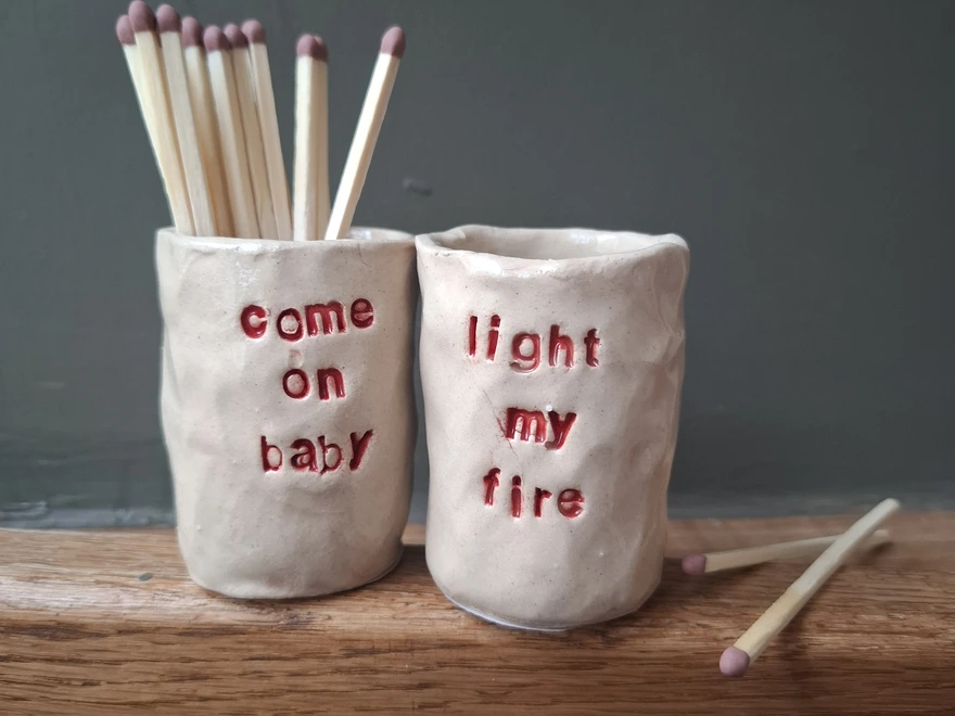 Vessel is made using a pinch pot technique with high fired creamy coloured stoneware clay. The base has a circle of match paper for striking the matches. Each letter is individually pressed into the clay to create the phrase - so exact lettering layout may vary from example photographed. Lettering is glazed in a red colour, exact shade of red may vary slightly.