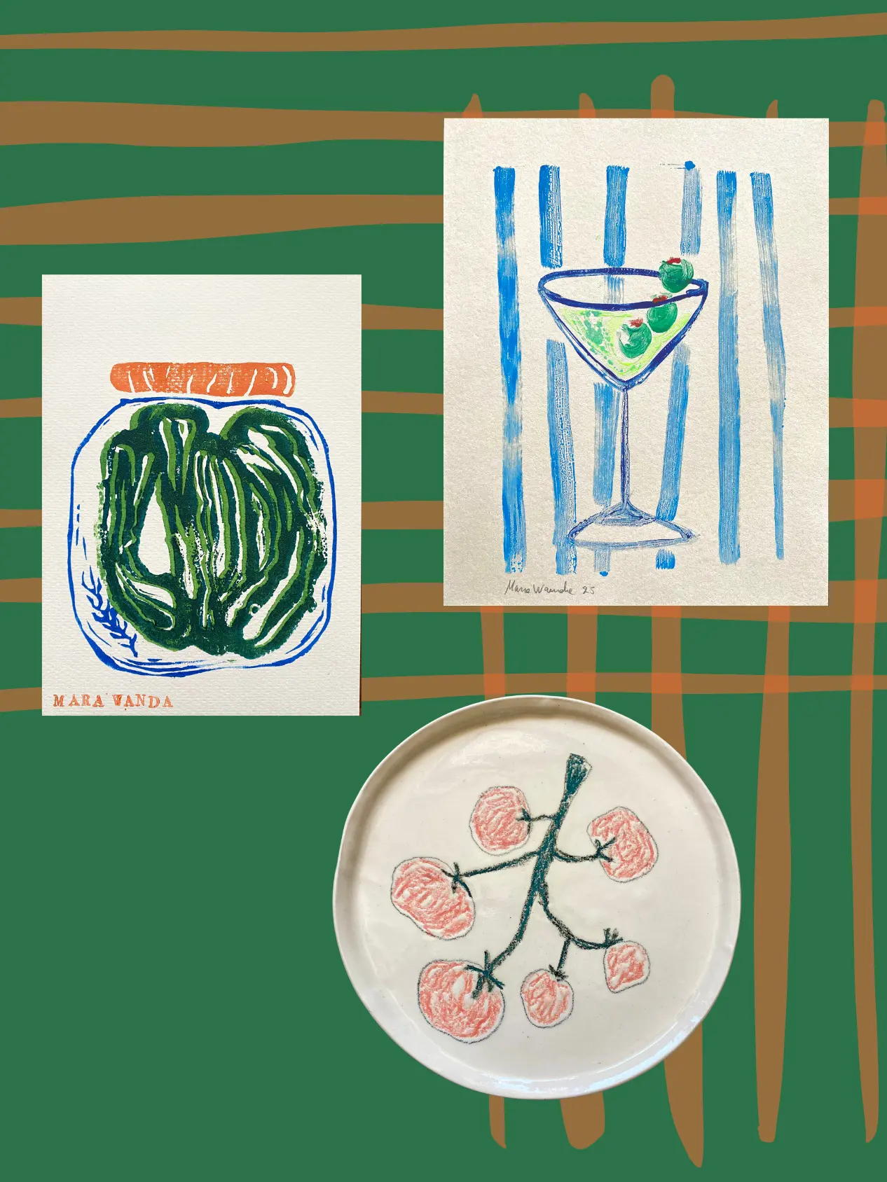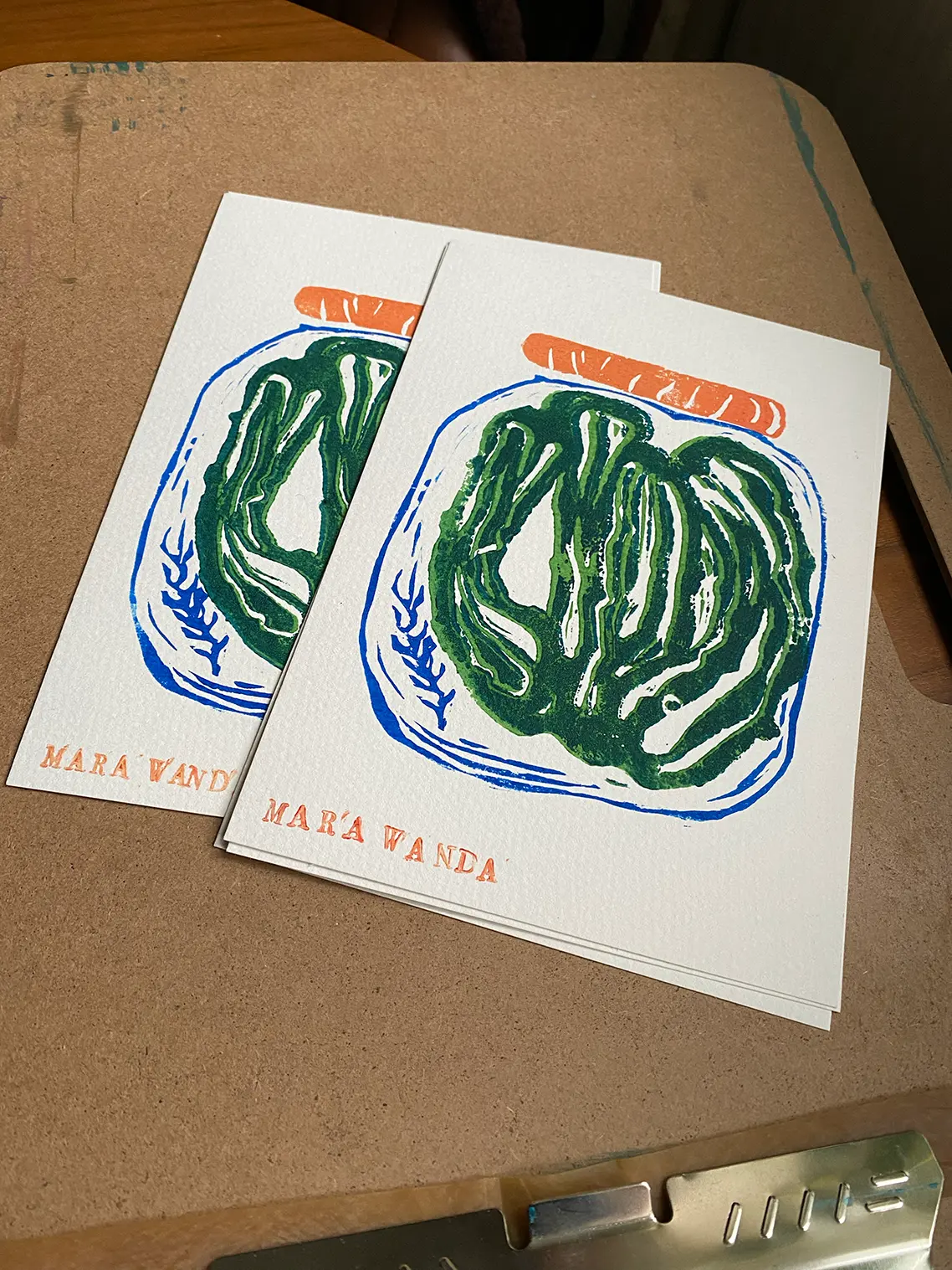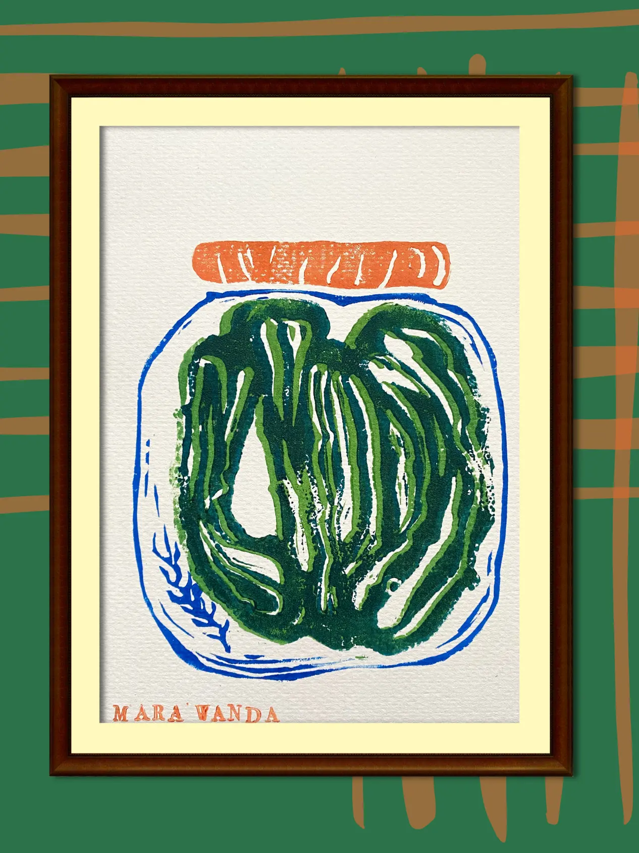 Introducing Mara Wanda unique Original Lino Cut Print featuring charming pickles in a jar! This A5 (5.8 x 8.3 inches) delightful artwork captures the whimsy of homemade preserves, perfect for food lovers and kitchen decor enthusiasts. Printed on high-quality paper, each piece is carefully crafted and showcases the intricate details of the hand-carved design. Add a touch of personality to your walls or gift it to a fellow pickle lover. Ideal for framing and displaying! Grab your one-of-a-kind piece today!