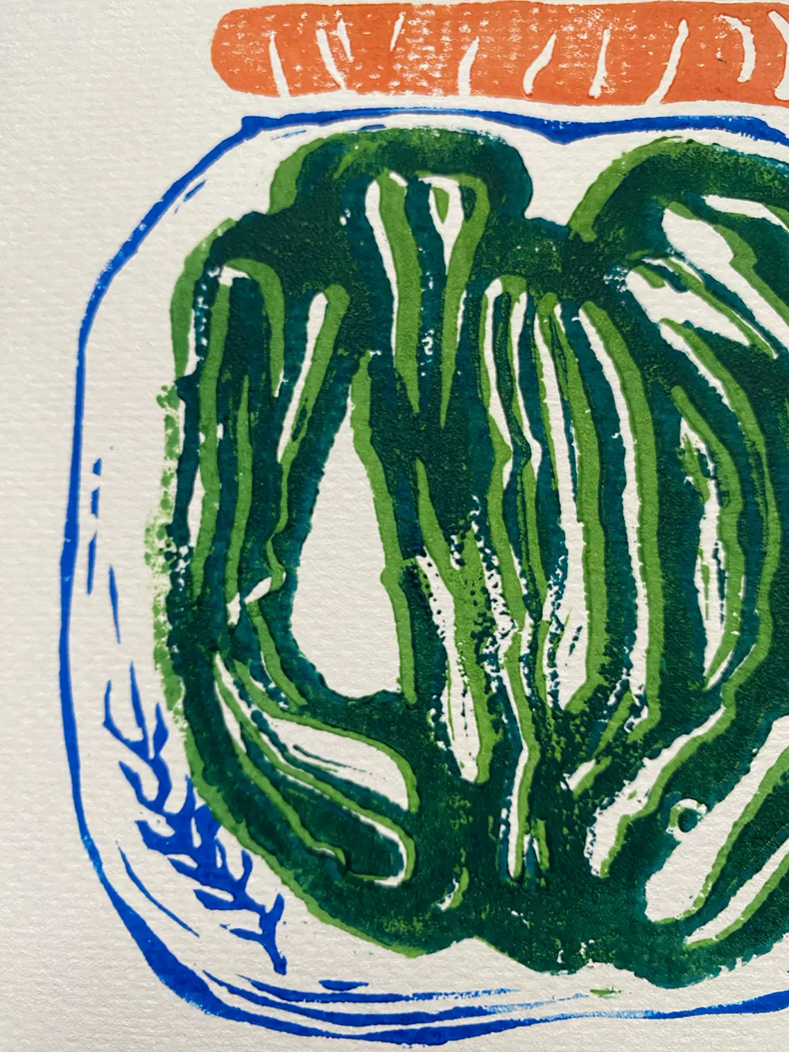 Handmade Pickles in Jar Lino Cut Print - Original Artwork