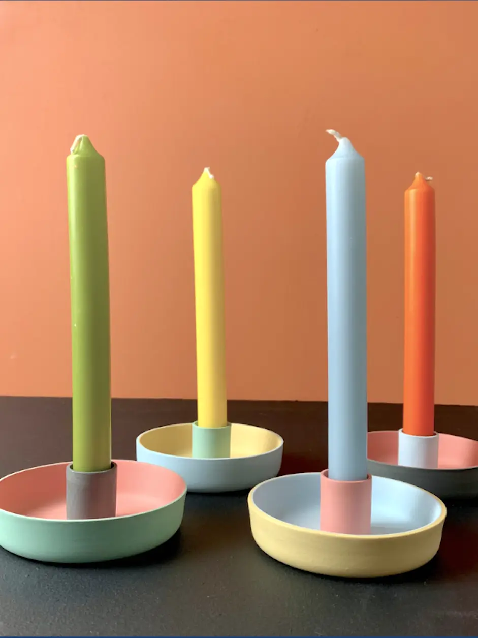 Simple and striking these super colourful candle holders will bring vibrancy to your table. Each piece has been created with 3 contrasting colours and left unglazed to give a warm tactile feel.