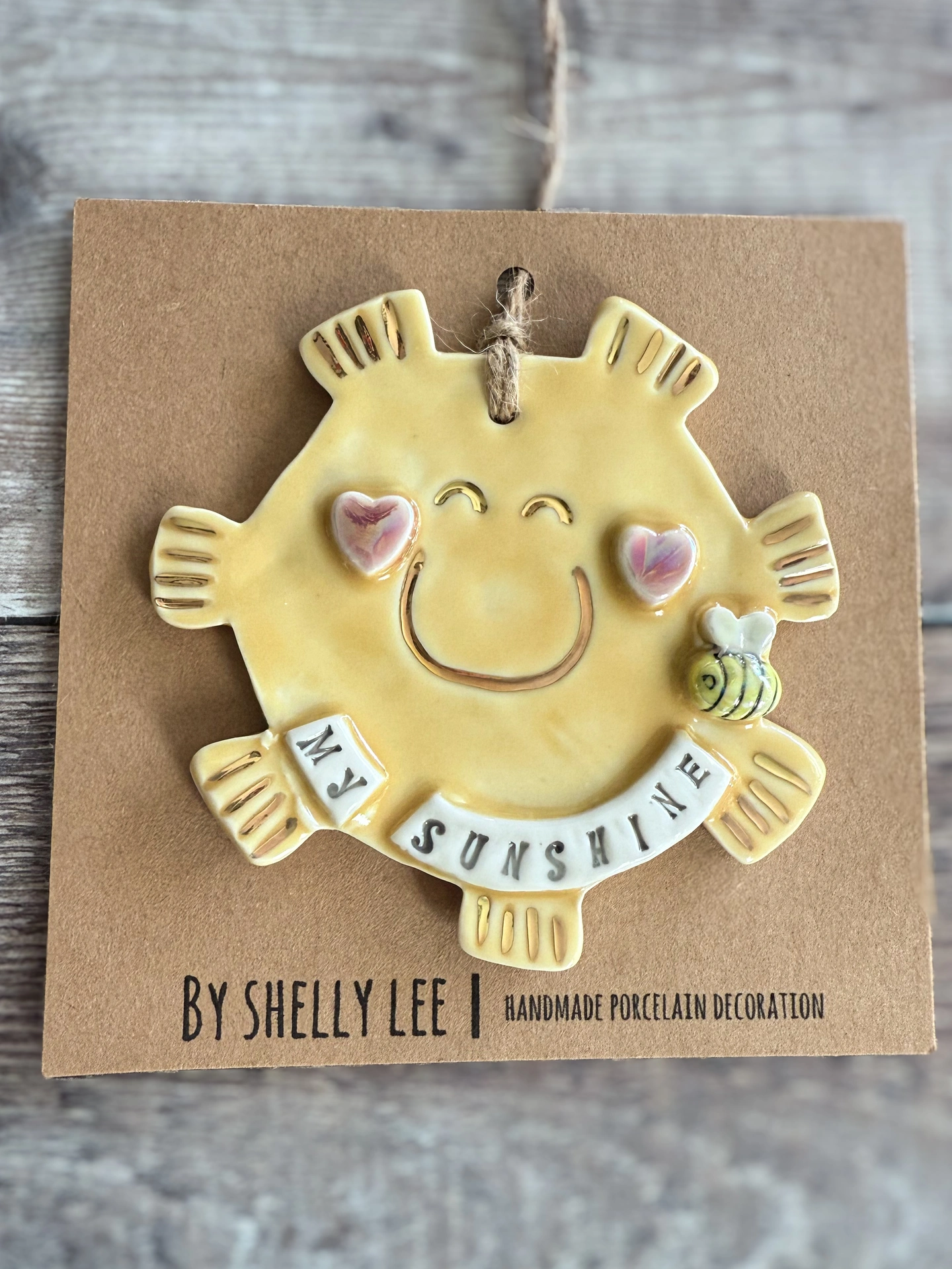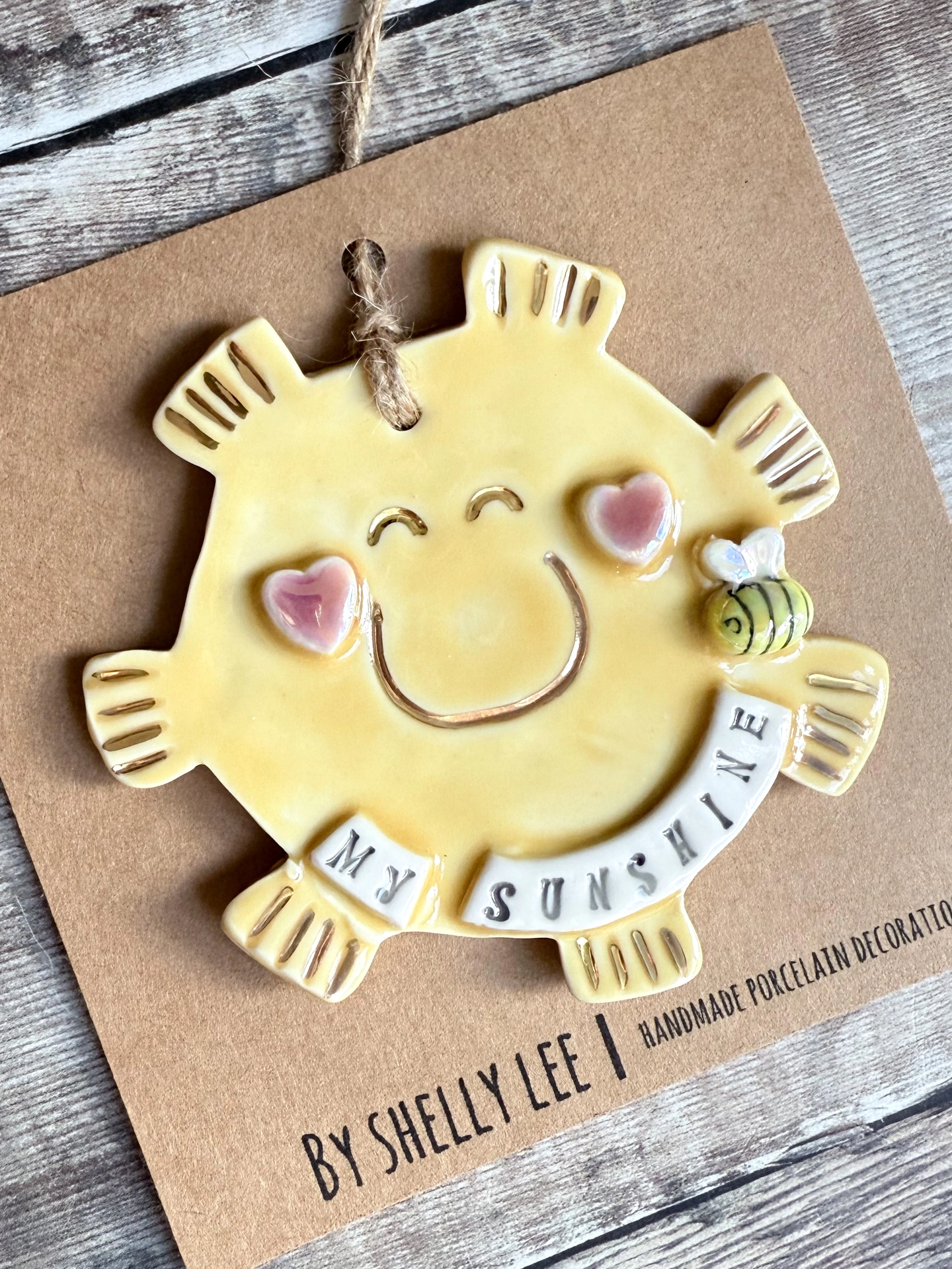Brighten up any space with this delightful handmade porcelain decoration. Crafted with care, this cheerful sun features a radiant yellow glaze, a beaming smile, and rosy heart-shaped cheeks that exude warmth and happiness. The charming design includes the phrase "MY SUNSHINE" delicately inscribed beneath the smile, adding a personal touch.