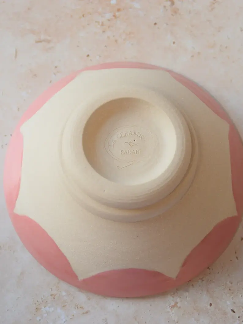 The dish features a gently flared rim and a shallow, round shape. This unique dish combines a natural beige raw clay base with a vibrant red glaze or pink glaze on the interior to add a touch of warmth and vibrancy.