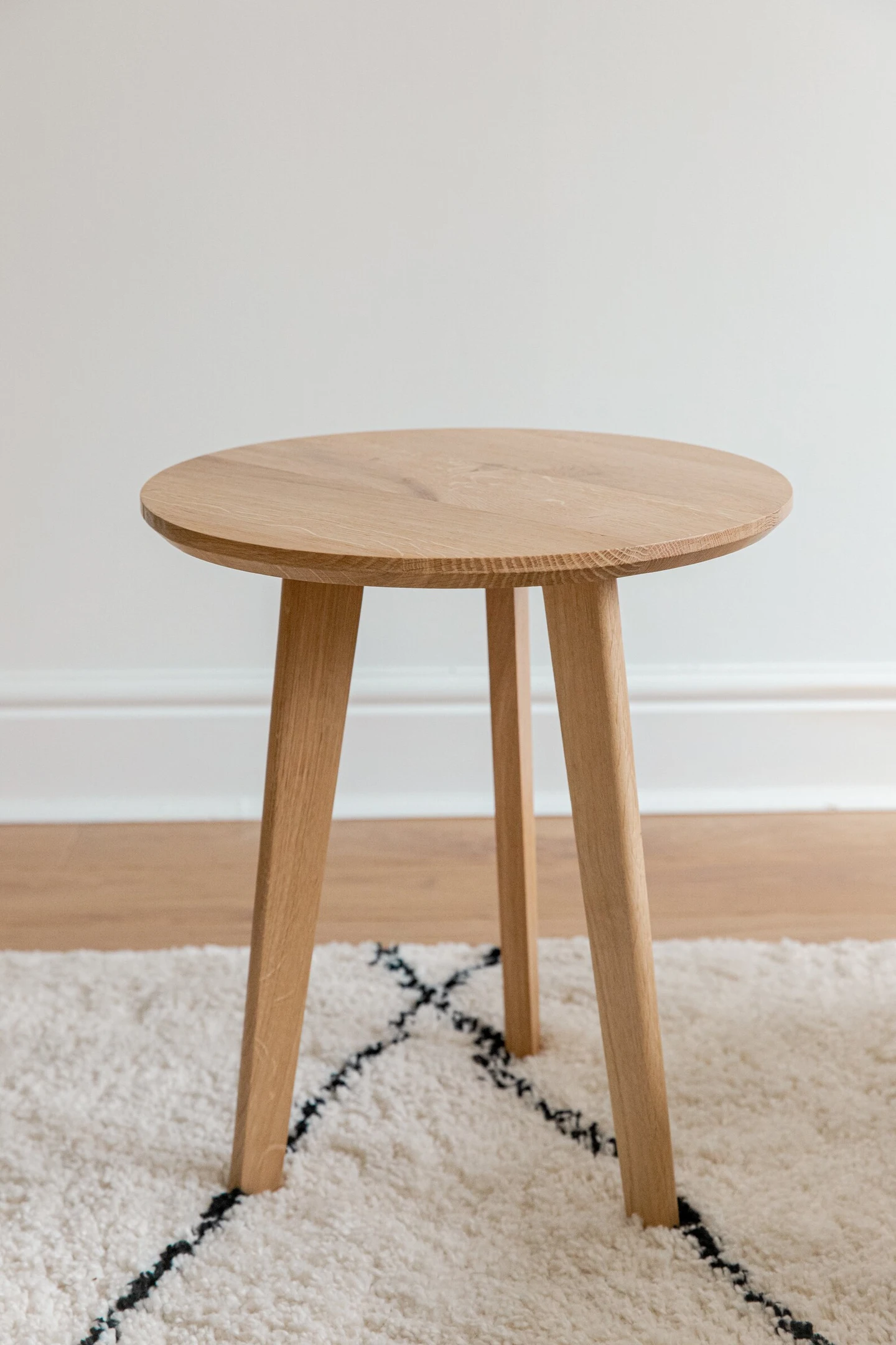 Small stylish side table or bedside table. A sleek and Scandinavian style with details such as half rounded legs and a chamfered edge to the underside of the top giving this piece a really nice look finished in a natural wax oil with a slight tint of white also gives it a nice feel.