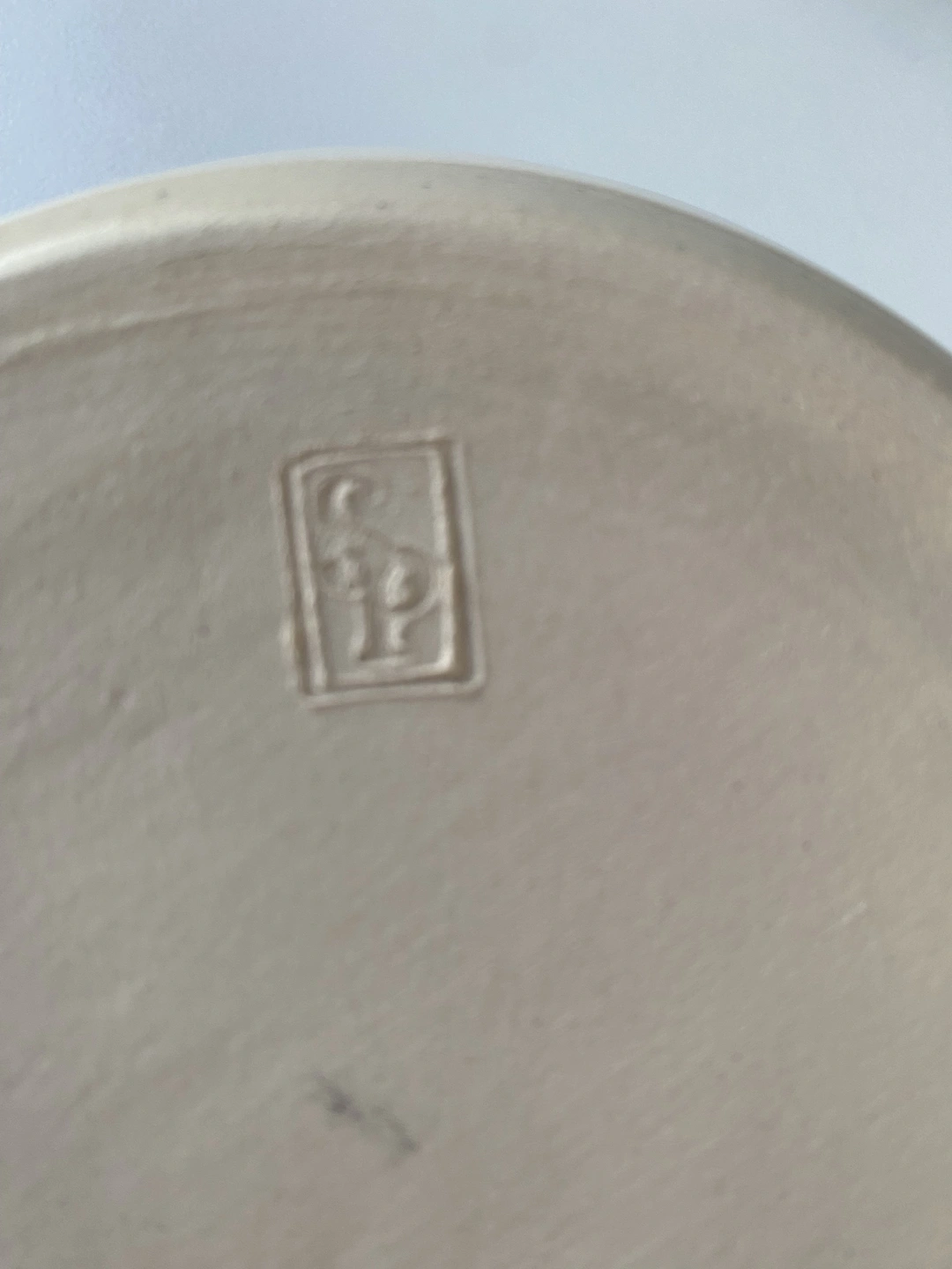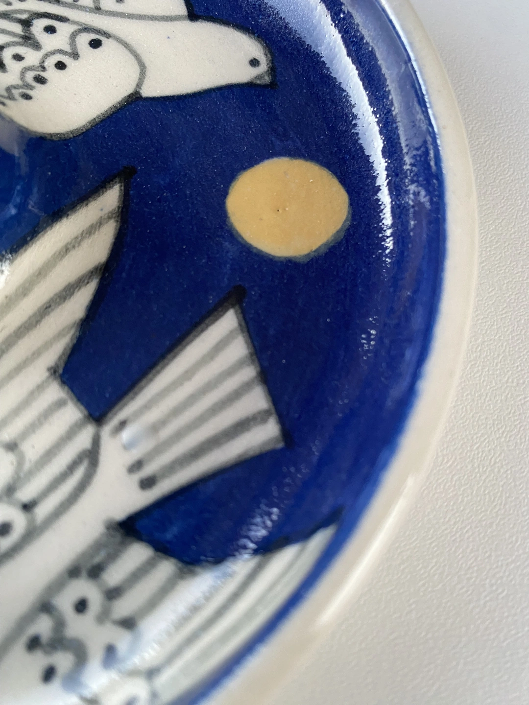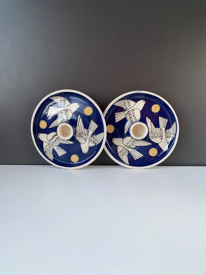 Beautiful candle holder with three illustrated bird going around the base of the candle holder with a yellow circle between each bird. Made using a paper resist method and then hand painting in the details on each bird. A lovely denim blue slip has been used in the background which compliments the three yellow circles very nicely.