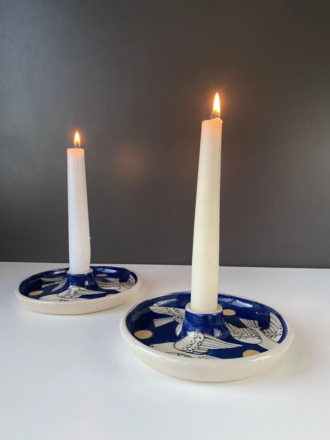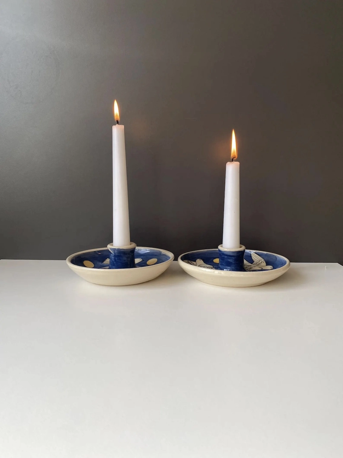 Each piece is handmade from raw stoneware clay which is bisque fired and then high fired to 1270 degrees, covered in a clear glaze which makes the candle holders fit for purpose.