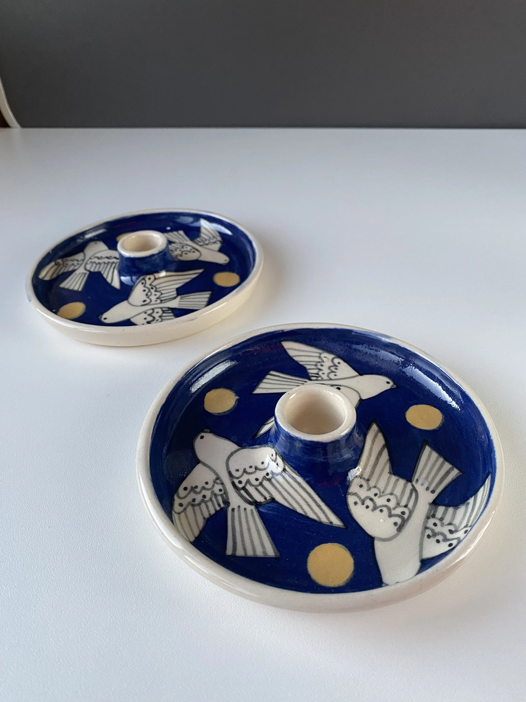 Beautiful candle holder with three illustrated bird going around the base of the candle holder with a yellow circle between each bird. Made using a paper resist method and then hand painting in the details on each bird. A lovely denim blue slip has been u...