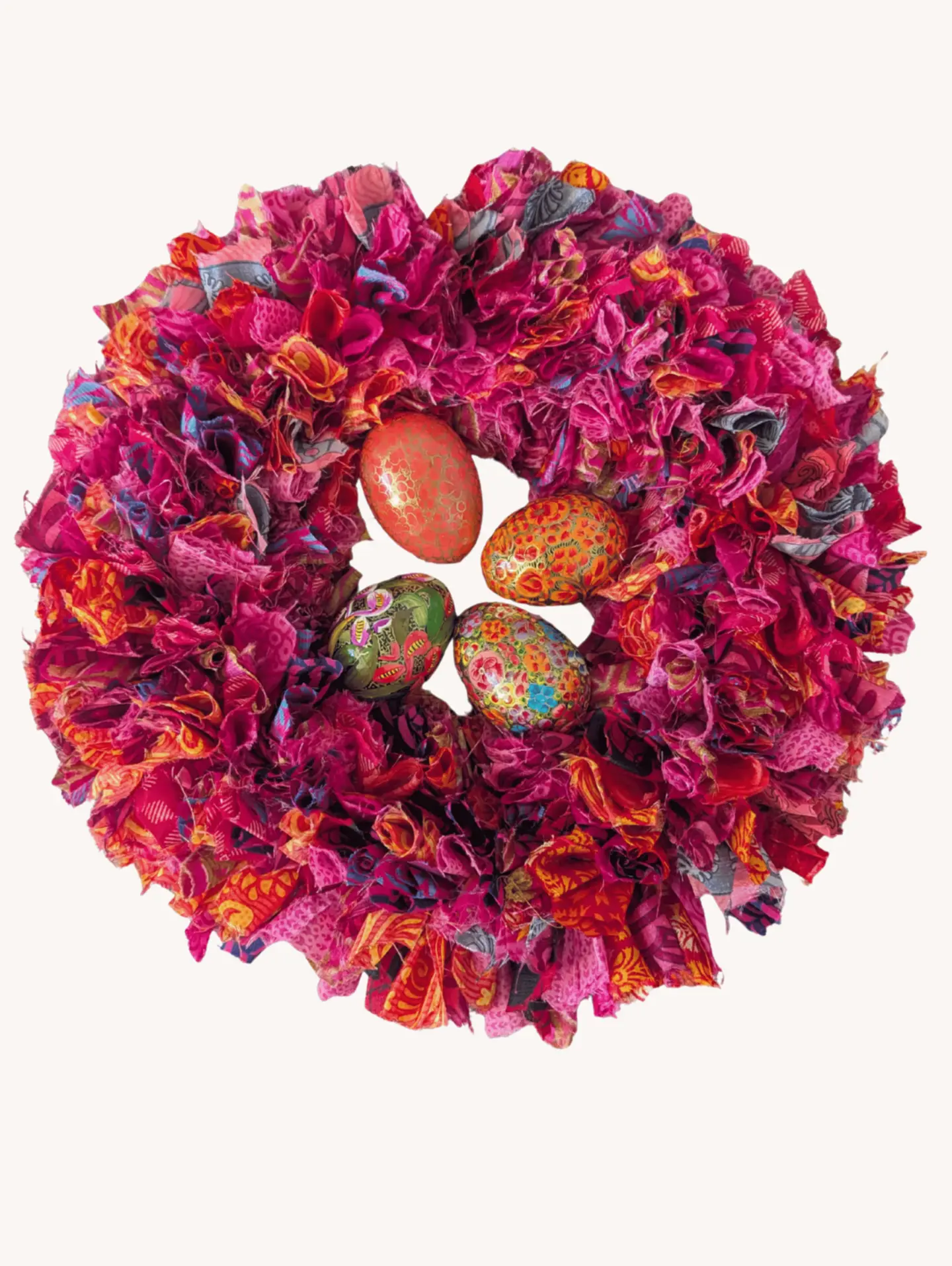 Note! Due to the upcycled nature of these products, there will be variation from the images for wreaths and eggs. Wreaths will be multicoloured, but if you'd like to see exact images, please get in touch.