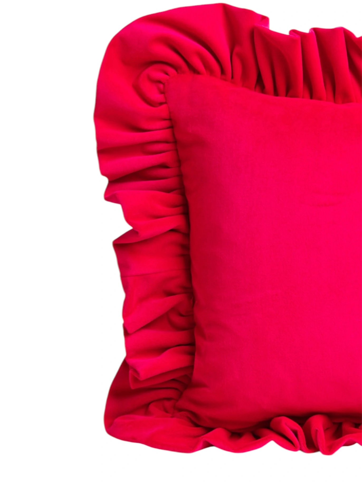Handmade by Kika Bespoke in a rich upholstery grade velvet with a full gathered ruffle detail. Velvet this grade goes in the wash and comes back looking brand new — which for a cushion you'll use every day is no small thing. Filled with a premium feather pad for a plump, supportive shape that holds its form.