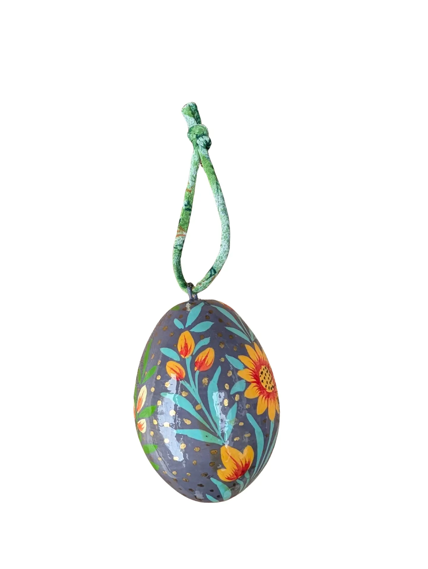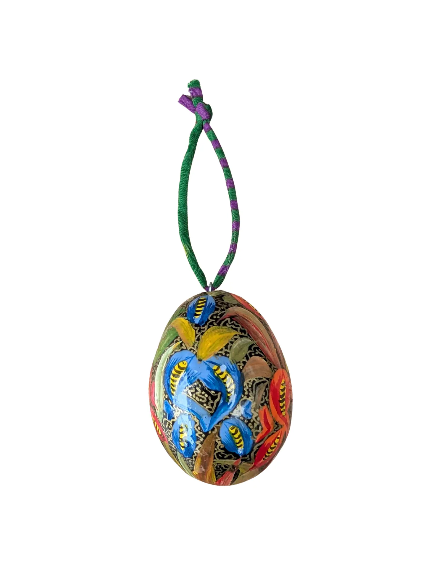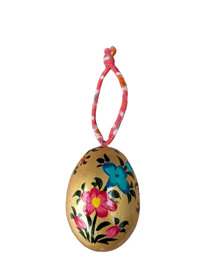 To finish, each egg is threaded with colourful string made from recycled saris, giving a second life to vibrant textiles that might otherwise go to waste. The combination of detailed painting and rich sari colours creates a decoration that feels both special and joyful.
