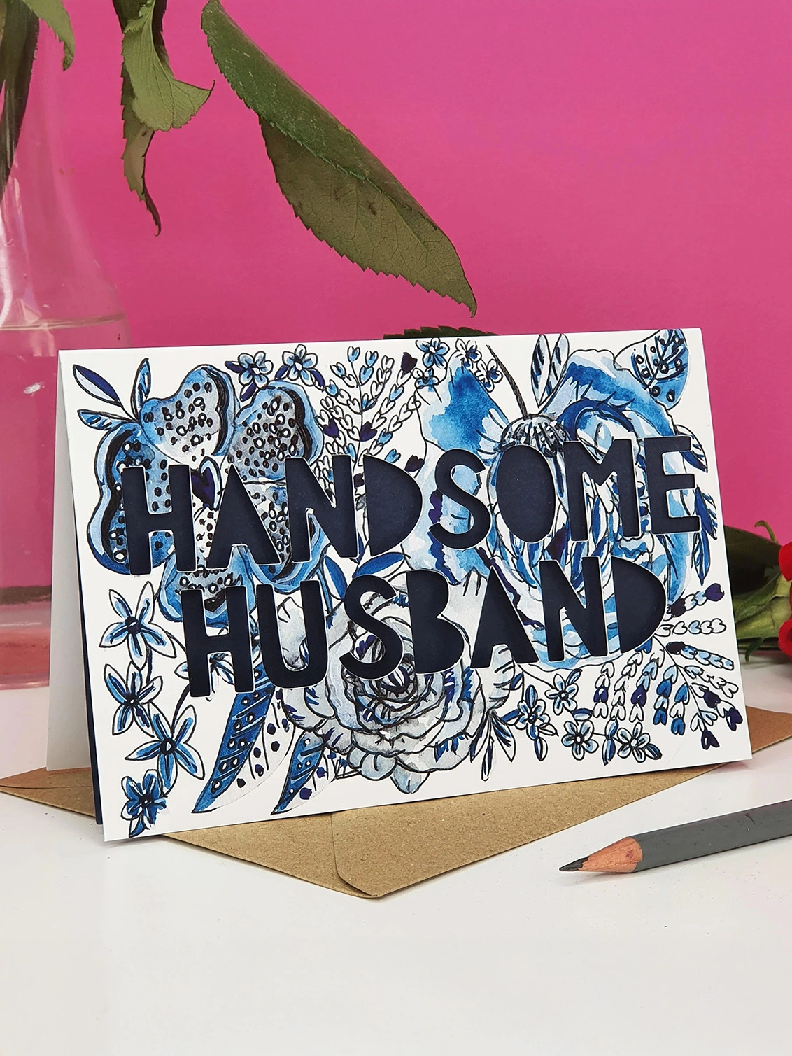 A card for your handsome husband or boyfriend, this is a perfect card and piece of mini-art for Valentine's Day, an Anniversary or wedding or even birthday with its inky blue flowers and paper cut typography which a royal blue liner.