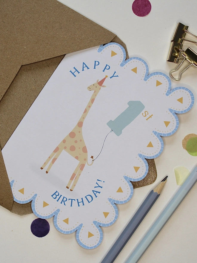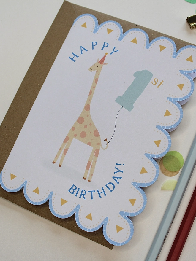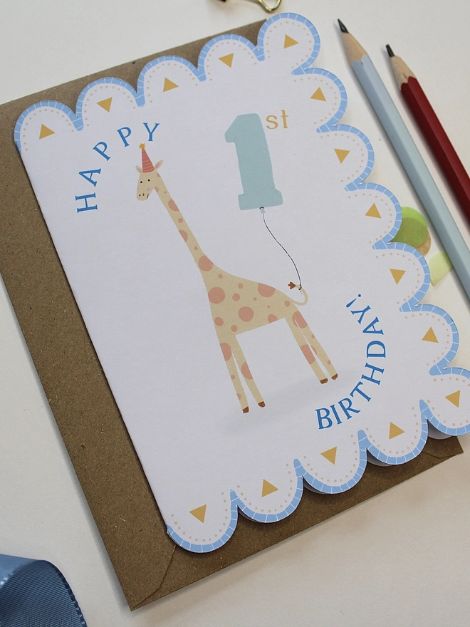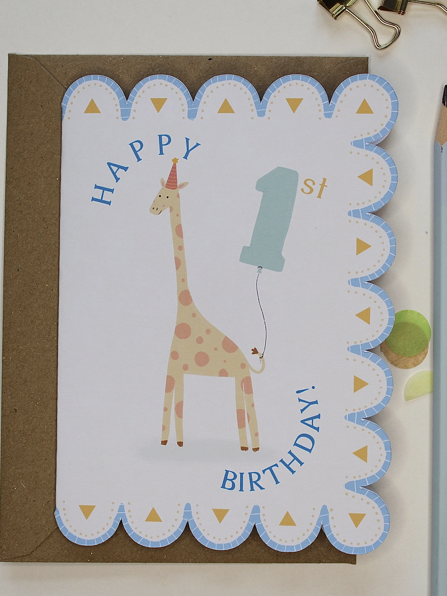 Celebrate your little one’s special day with this whimsical birthday card! Featuring a colourful giraffe in a party hat holding a balloon. This unique design is perfect for sending birthday wishes to a grandchild, niece, nephew or any special child who is celebrating their very first birthday. The scalloped edge adds a special touch, making this card as fun and unique as your loved one. Ideal for birthdays, this card will bring joy and laughter to their celebration! Make their day extra special with this charming, one-of-a-kind card!
