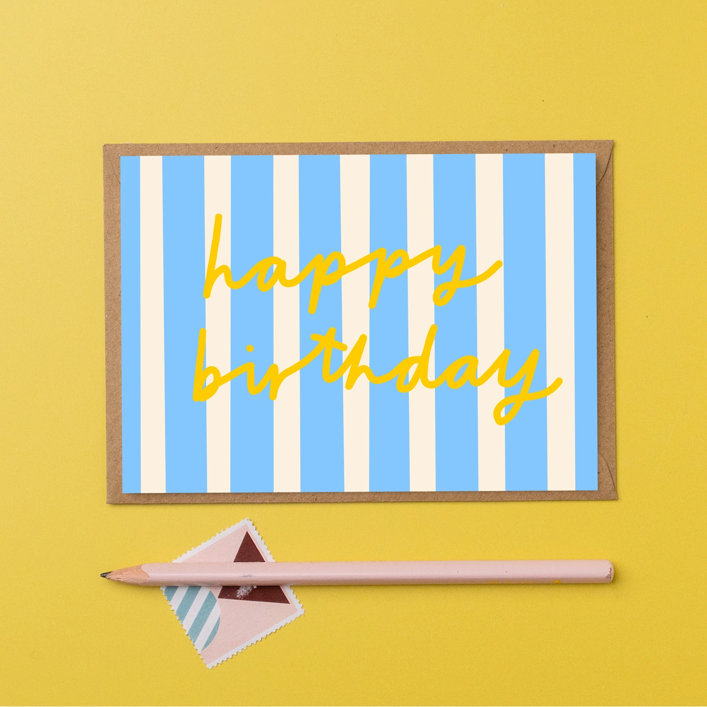 A simple yet bold birthday card featuring blue stripes and handwritten yellow font.