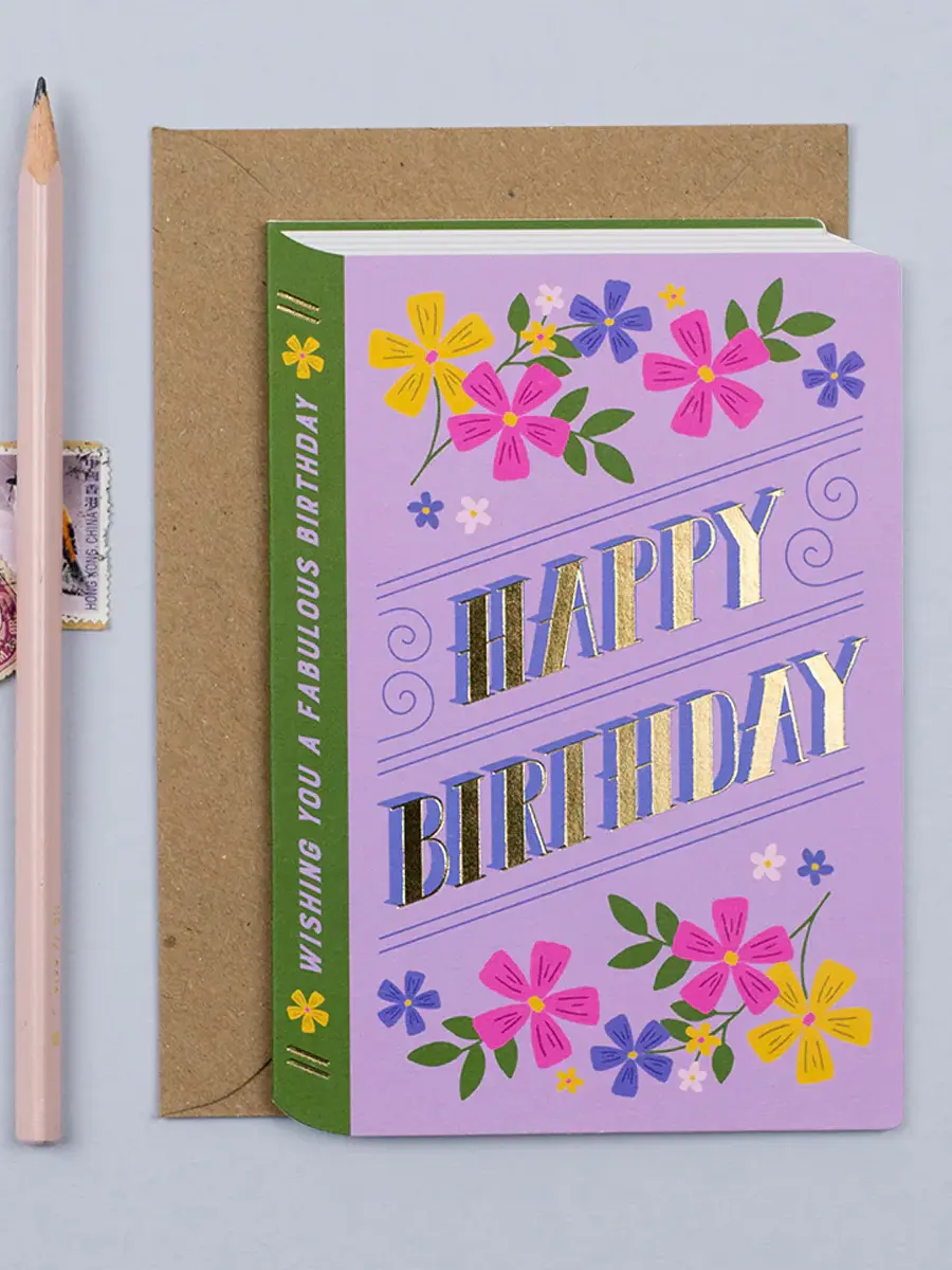 Celebrate the big day with this unique birthday card, which is die cut into the shape of a book. The gold foil on the front cover of this storybook birthday card reads “Happy Birthday”, while the spine of the book offers a second caption reading “Wishing you a Fabulous Birthday”. Crack open this storybook birthday card and add your own tale of a birthday worth remembering.
