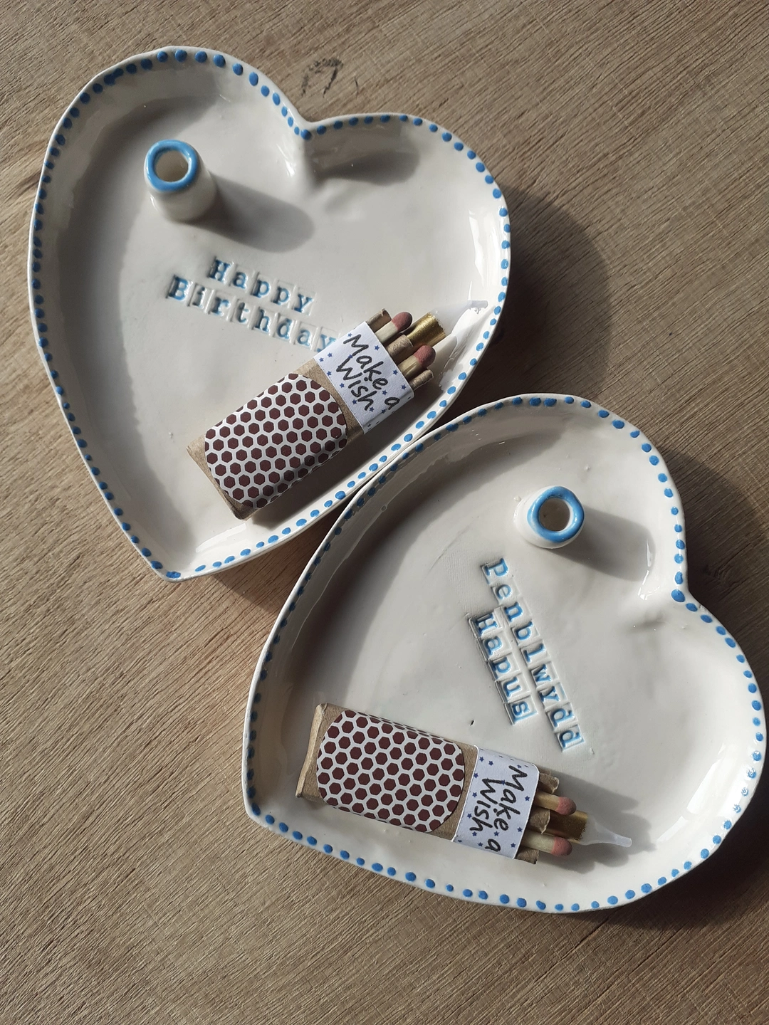 This handmade ceramic heart dish is designed to hold a single birthday candle — a small, meaningful moment of pause, celebration, and wish-making. Pressed into the surface are the words “Happy Birthday” or the Welsh “Penblwydd Hapus,” making each dish both a keepsake and a celebration in itself.
