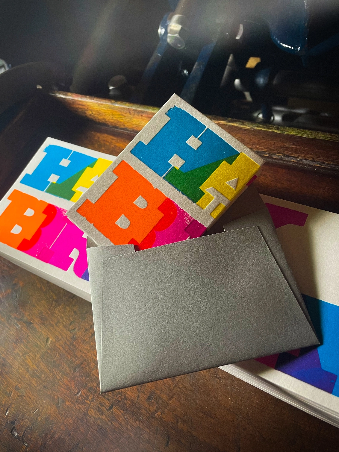 These cards are printed with my own fair hands on my 1915 Arab Crown Folio Press. The card is hand-fed into the press for each of the six passes. Printed using vibrant translucent inks using a deep impression print. Printed on the finest Colorplan Pristine White thick 350gsm double-sided card with a range of matching colours of Colorplan 135gsm self-seal envelope; recognised as one of the best double-sided coloured cards on the market, Colorplan is manufactured from 100% virgin ECF fibre.