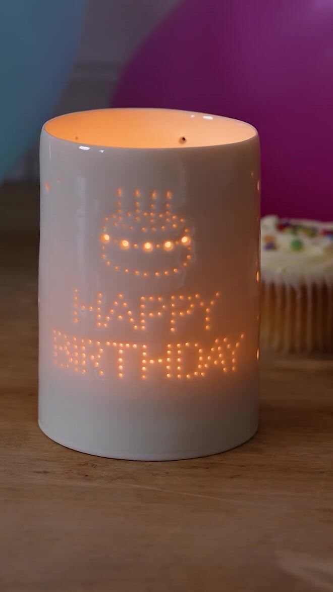 Wonderful for the mantlepiece, on the dining table or in the garden are the enchanting fine porcelain tea light holders, the Luna Maxis. Each is hand thrown and decorated with tiny holes with the words 'Happy Birthday' and an image of a cake with candles...