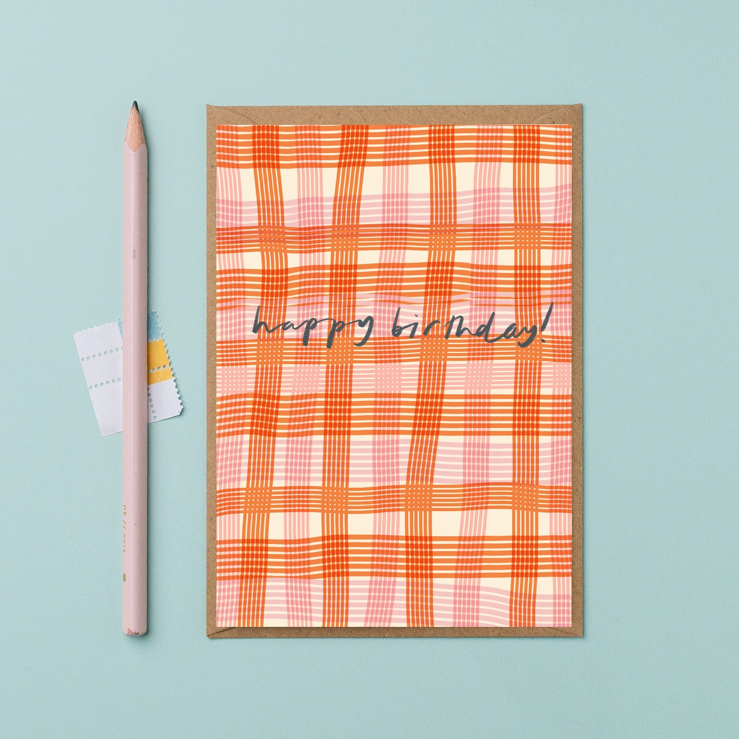 A fun birthday card featuring a pink and red checked pattern and the words Happy birthday. A brilliant card for a friend's birthday.