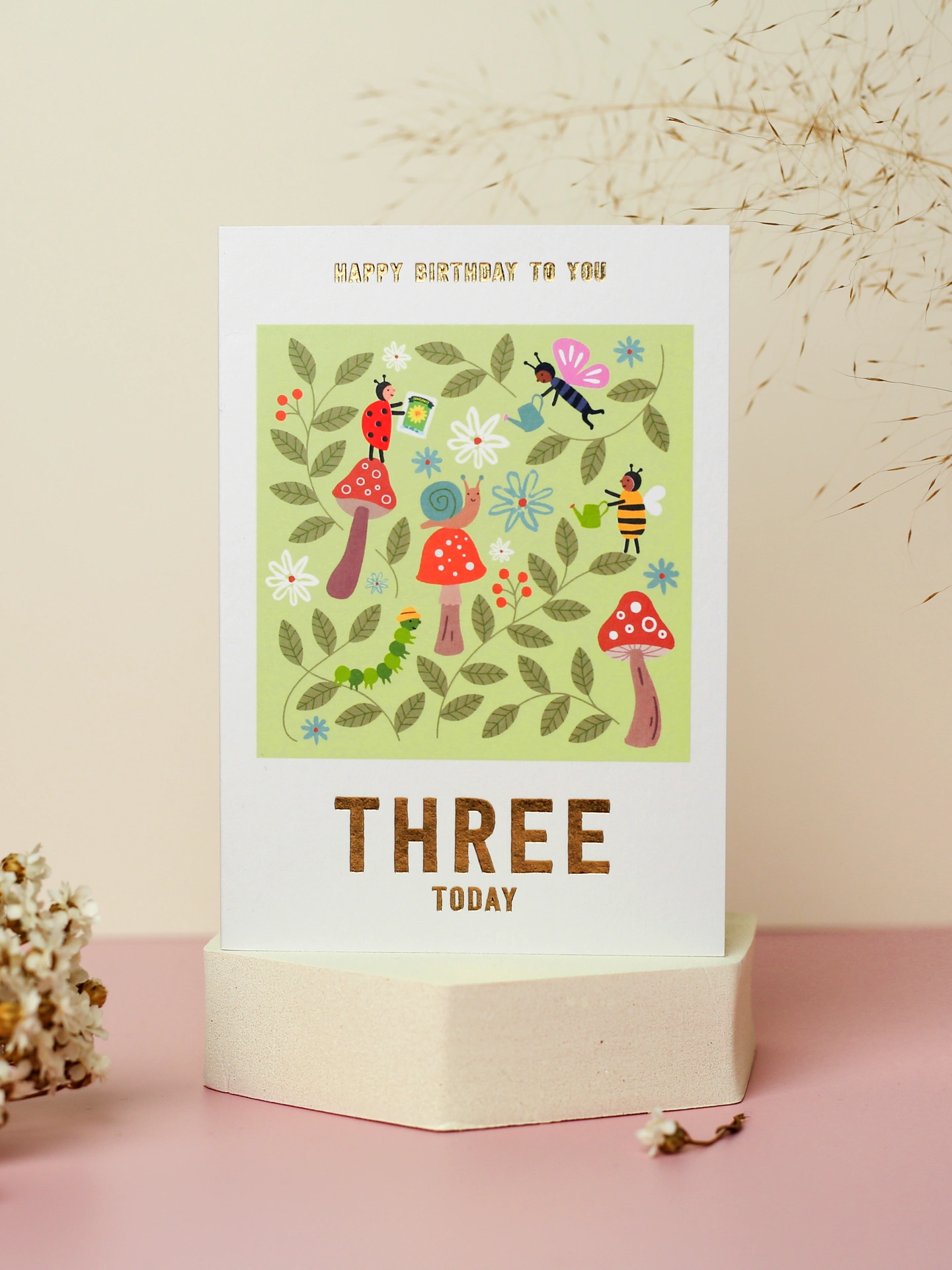The forest is simply buzzing with excitement for this kid’s birthday! The bumblebee, ladybird, snail and caterpillar have come together on this 3rd birthday card to throw a party among the flowers to help celebrate the big day. Gold foil captions on the top and bottom of this children’s birthday card read ‘Happy Birthday to You’ and ‘Three Today’.