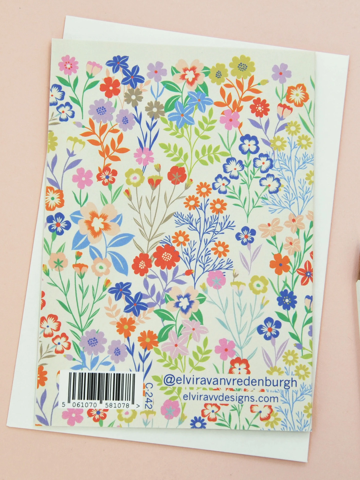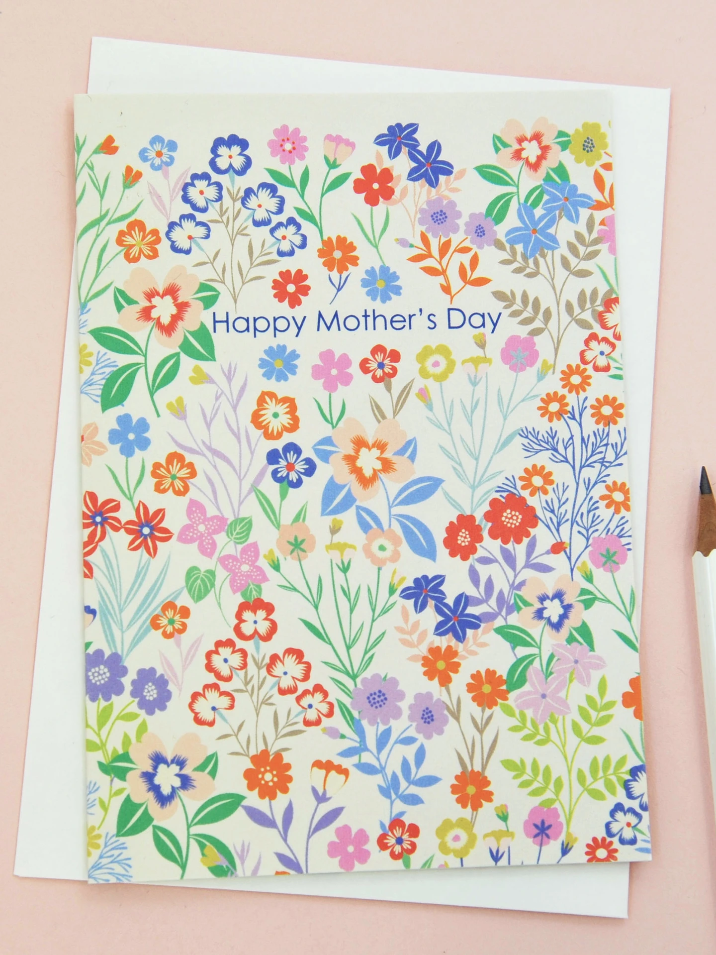 A sweet and pretty Mother’s Day card featuring a ditsy meadow floral with delicate stems and scattered blooms. Soft spring shades of pink, coral, green and blue sit beautifully against a warm cream background, creating a gentle, nature inspired feel.