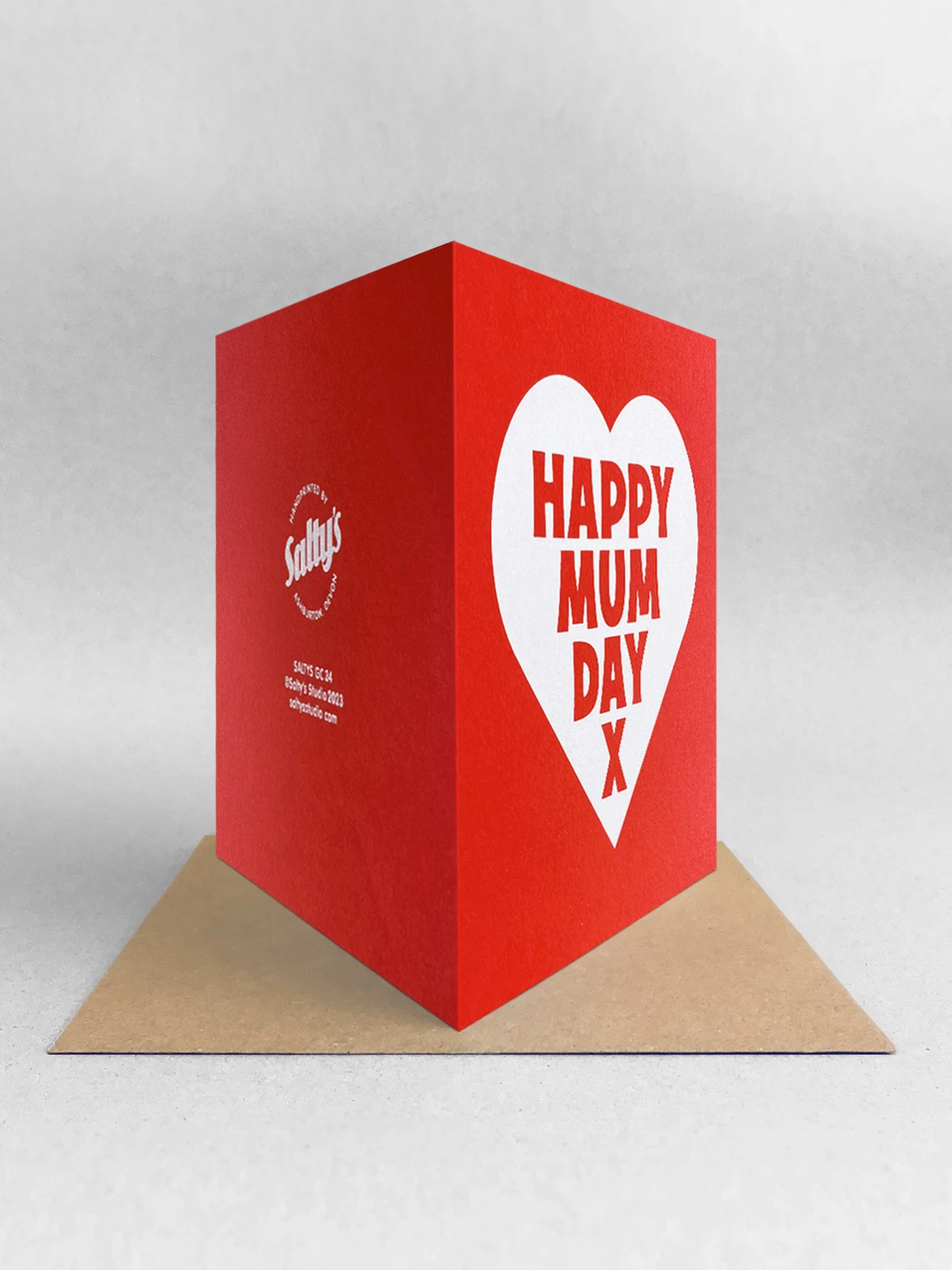 Crafted with love and attention in our Ashburton studio shop, our screen printed card features a fresh heart design containing the words Happy Mum Day x