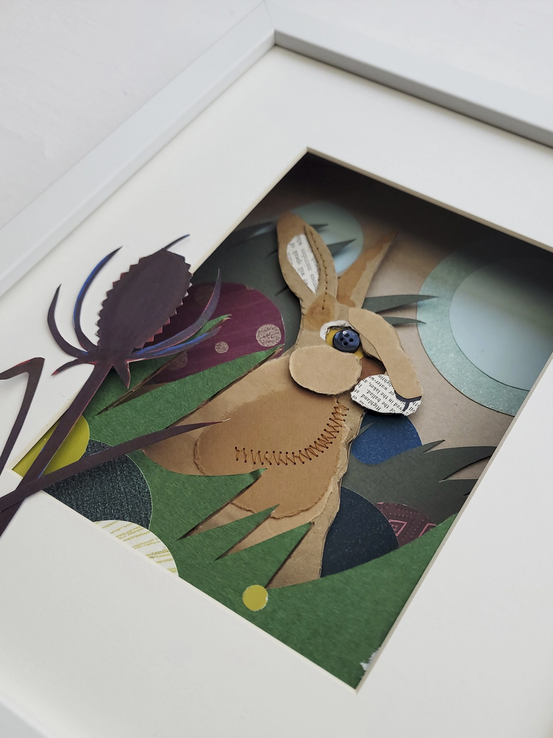 One of the most iconic wild animals found in Britain, this mixed media hare is created using a wide range of salvaged materials from salvaged tweed scraps to old maps. Primarily made from corrugated card she is embellished with paper and fabric collected from end of season sample books, recycled buttons, finished off with hand sewn highlights.