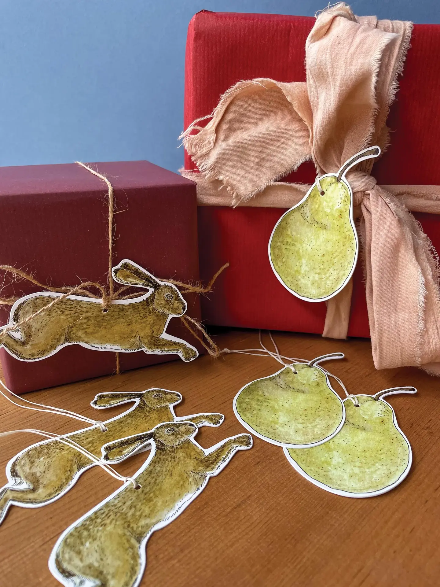 Pears and Hares Gift Tags - Pack of 6: 3 Pears + 3 Hares.