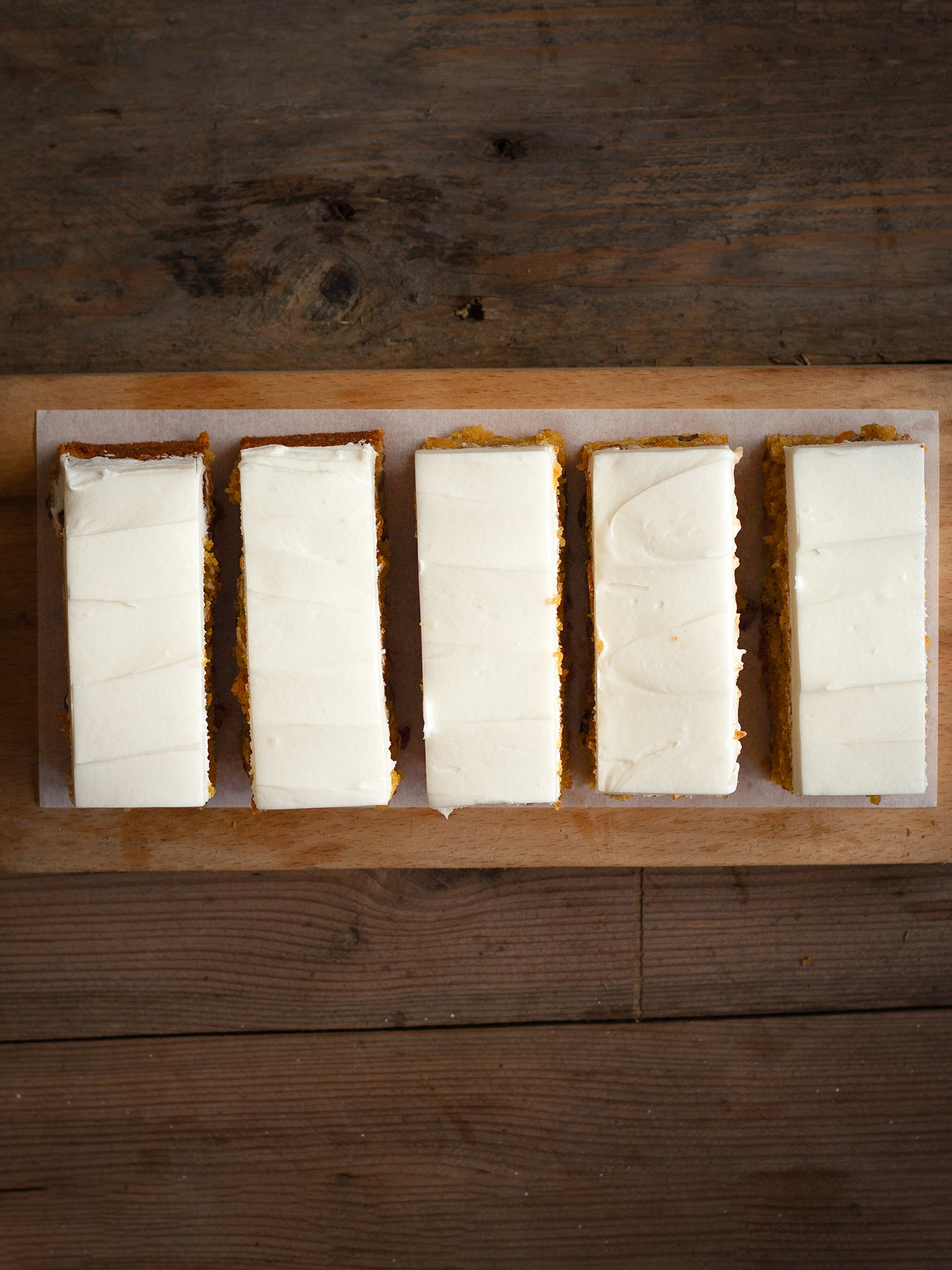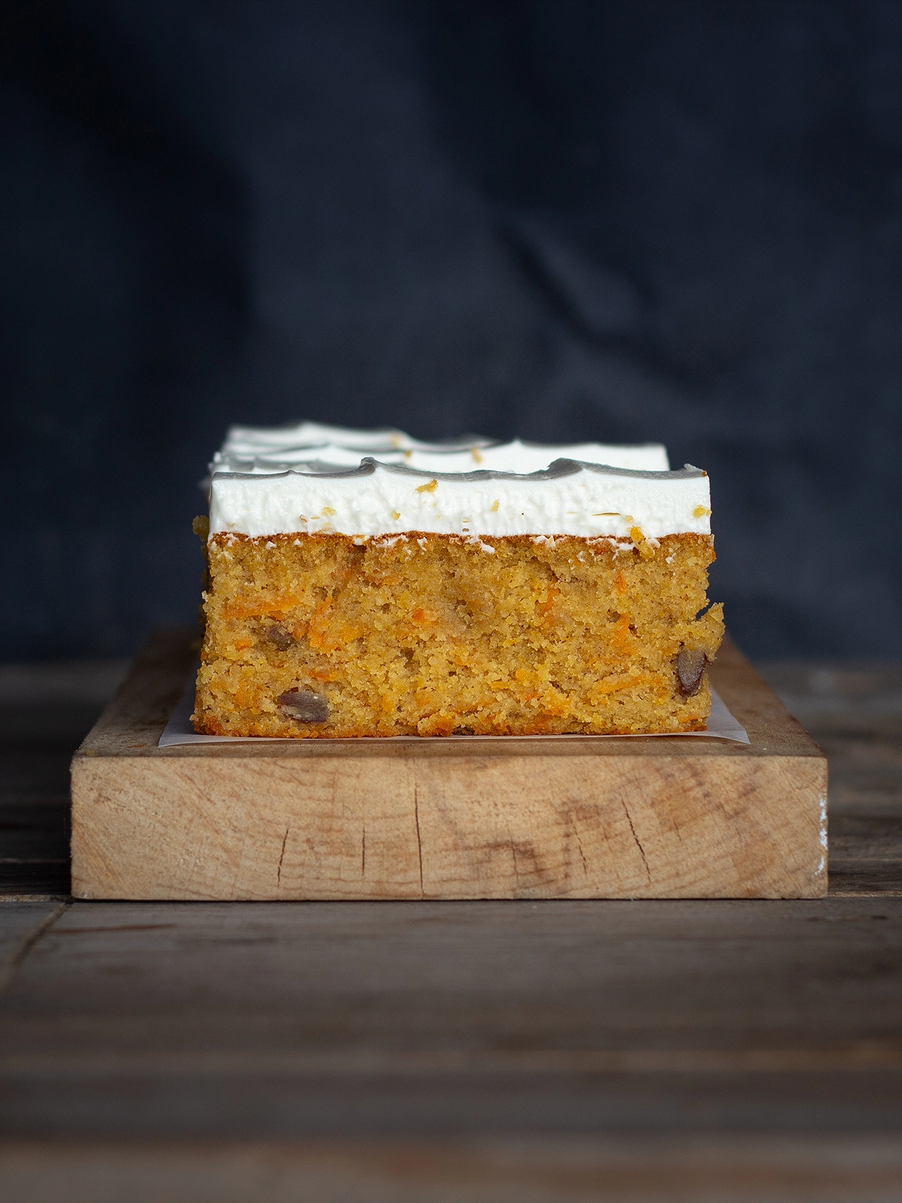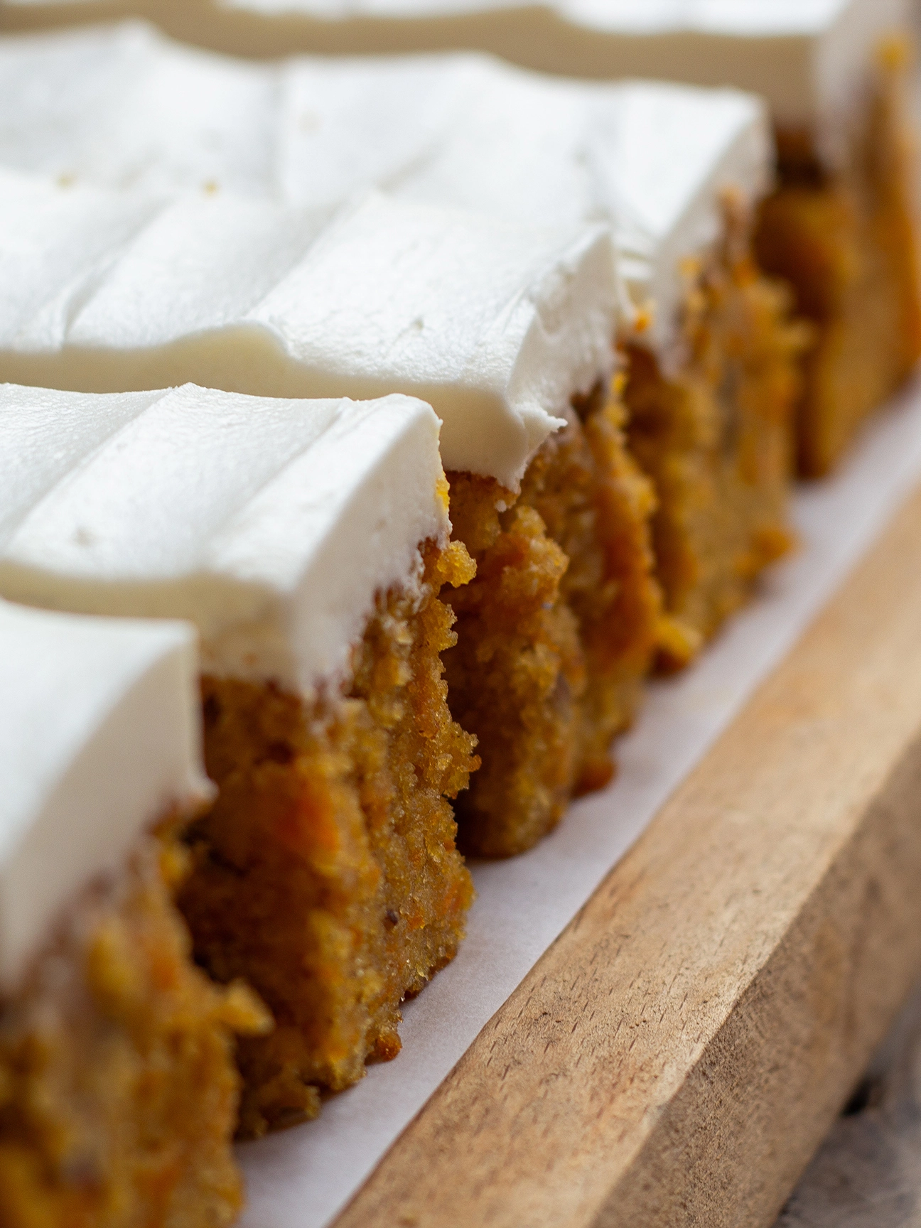 Icing Sugar (sugar, maize starch), Light Brown Sugar, Ground ALMONDS (NUTS), Free Range EGGS, Sunflower Oil, Carrots, Polenta, Vegan Butter (plant oils (sunflower, rapeseed), coconut fat, water, fava bean preperation, emulsifier (lecithin), natural flavouring, colour (carotenes)), Oranges, PECANS (NUTS), Golden Syrup (partially inverted refiners syrup; lyles golden syrup; sugarcane syrup), Caster Sugar, Vanilla Flavouring (Water, Propylene Glycol, Flavourings, Colour: Plain Caramel), Sea Salt, Mixed Spice (Coriander, Cinnamon, Fennel, Ginger, Caraway, Cloves, Nutmeg, Pimento), Ground Ginger.