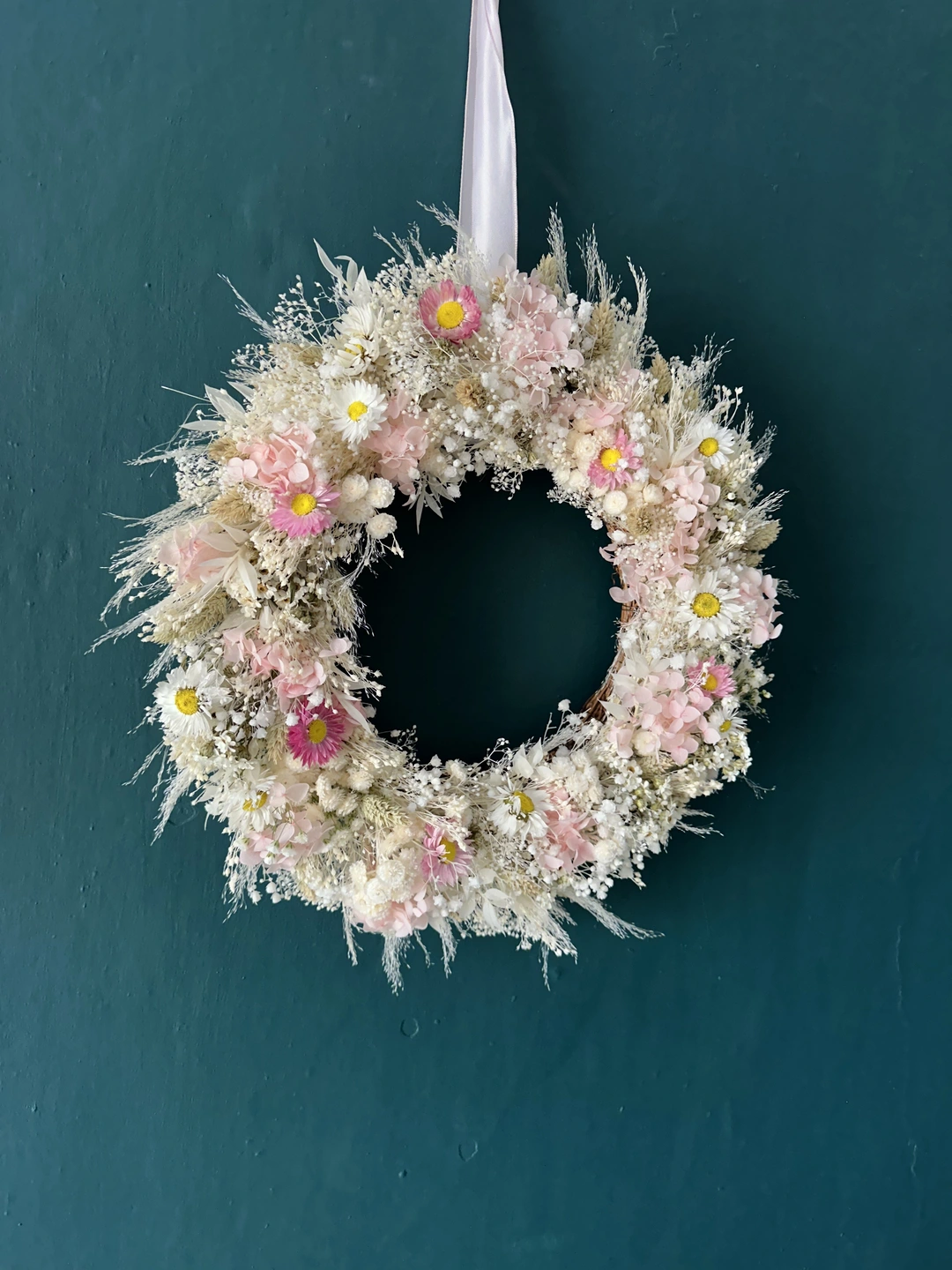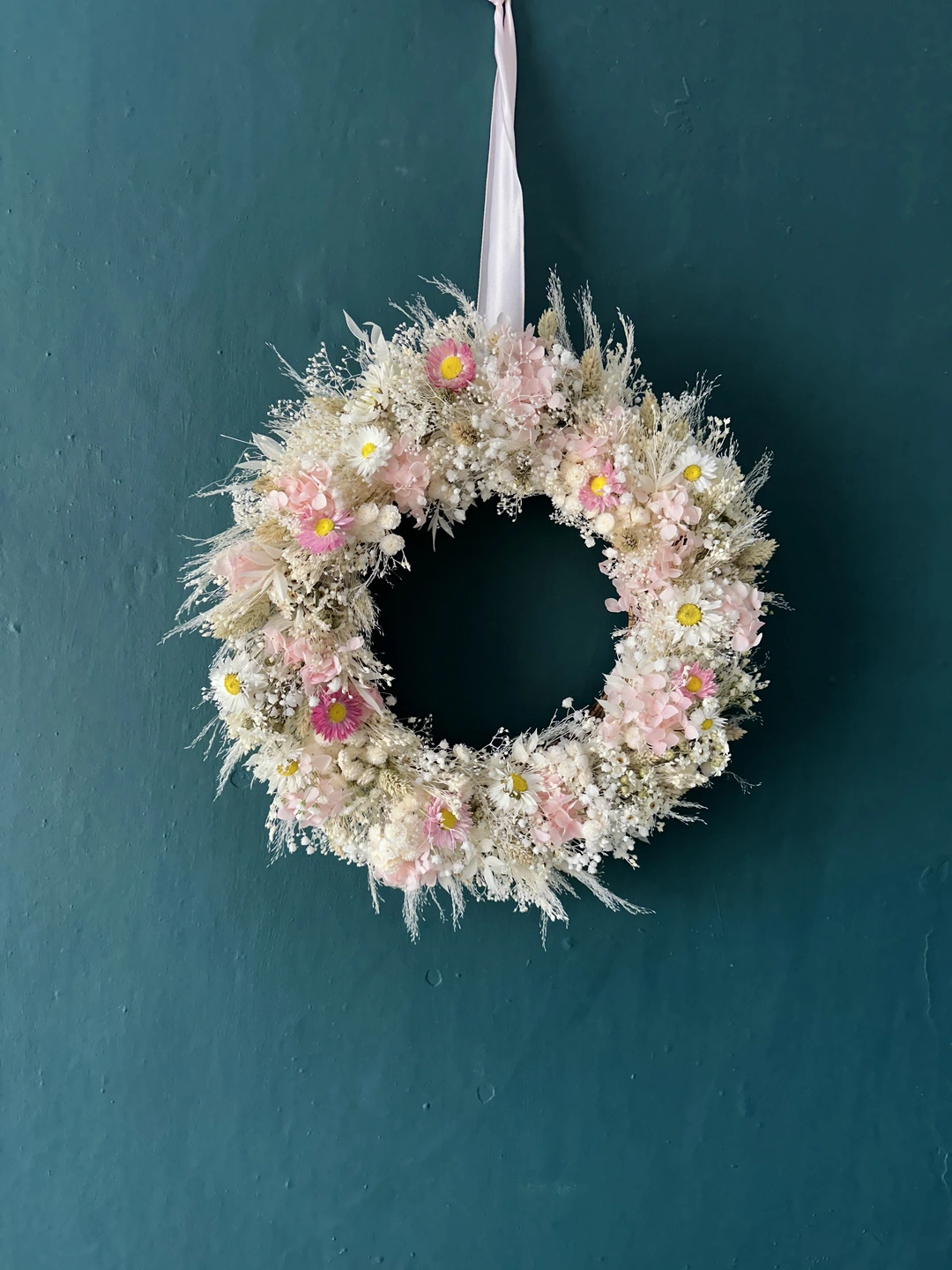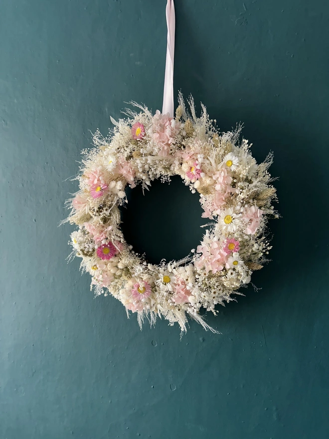 This beautiful gentle dried floral wreath bring calm and quietness. Blush pink presesrved hydrangeas, ivory gypsophilia and white broom make up this circle of romance. Delicate clusters, hand picked to create a cloud like texture, this soft subtle arrangement is perfect in a bedroom or lounge.
