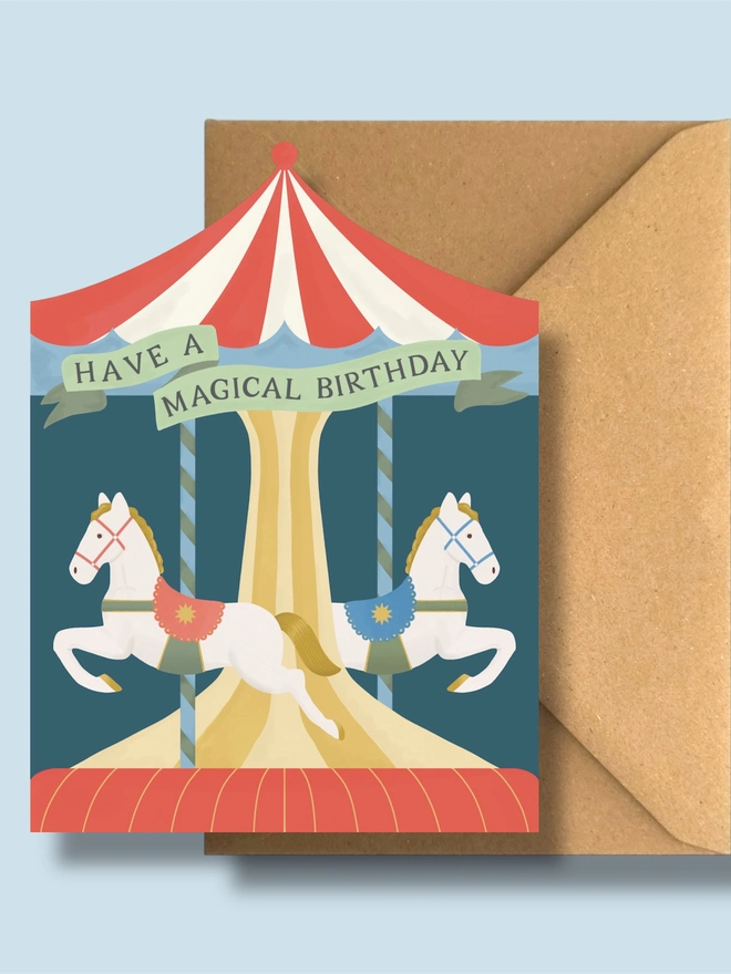 Bring birthday magic to life with this whimsical kids’ birthday card, featuring two carousel horses and a playful circus theme. With the message “Have a Magical Birthday”, it’s perfect for boys or girls who love fun, fantasy, and celebration. Ideal for carnival-themed parties, children’s birthdays, or as a keepsake from a special day. Printed on high-quality cardstock with a vibrant illustrated design.
