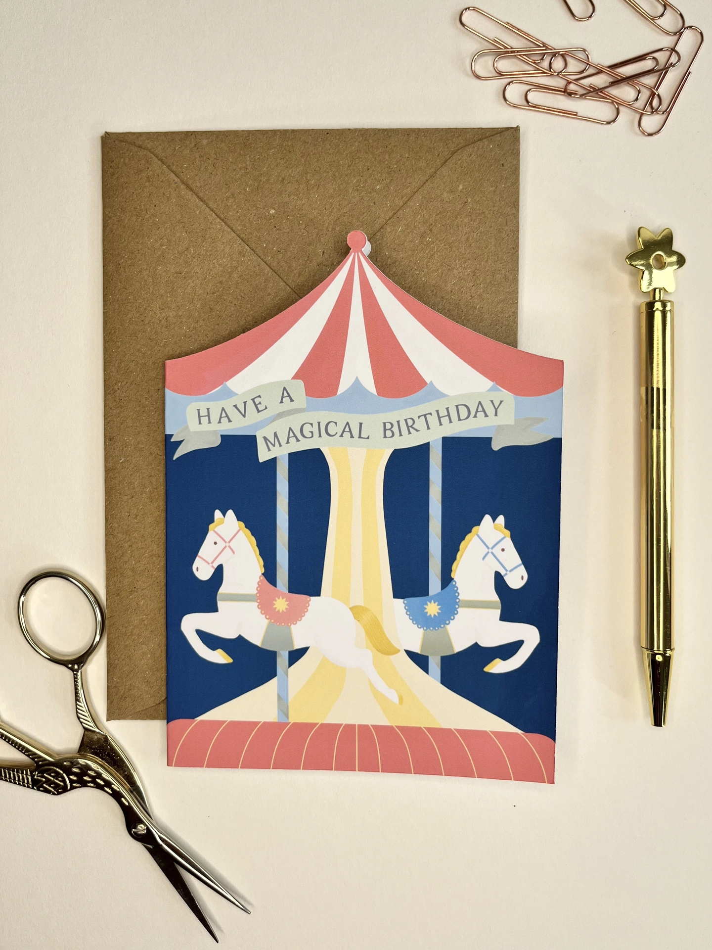 Bring birthday magic to life with this whimsical kids’ birthday card, featuring two carousel horses and a playful circus theme. With the message “Have a Magical Birthday”, it’s perfect for boys or girls who love fun, fantasy, and celebration. Ideal for ca...