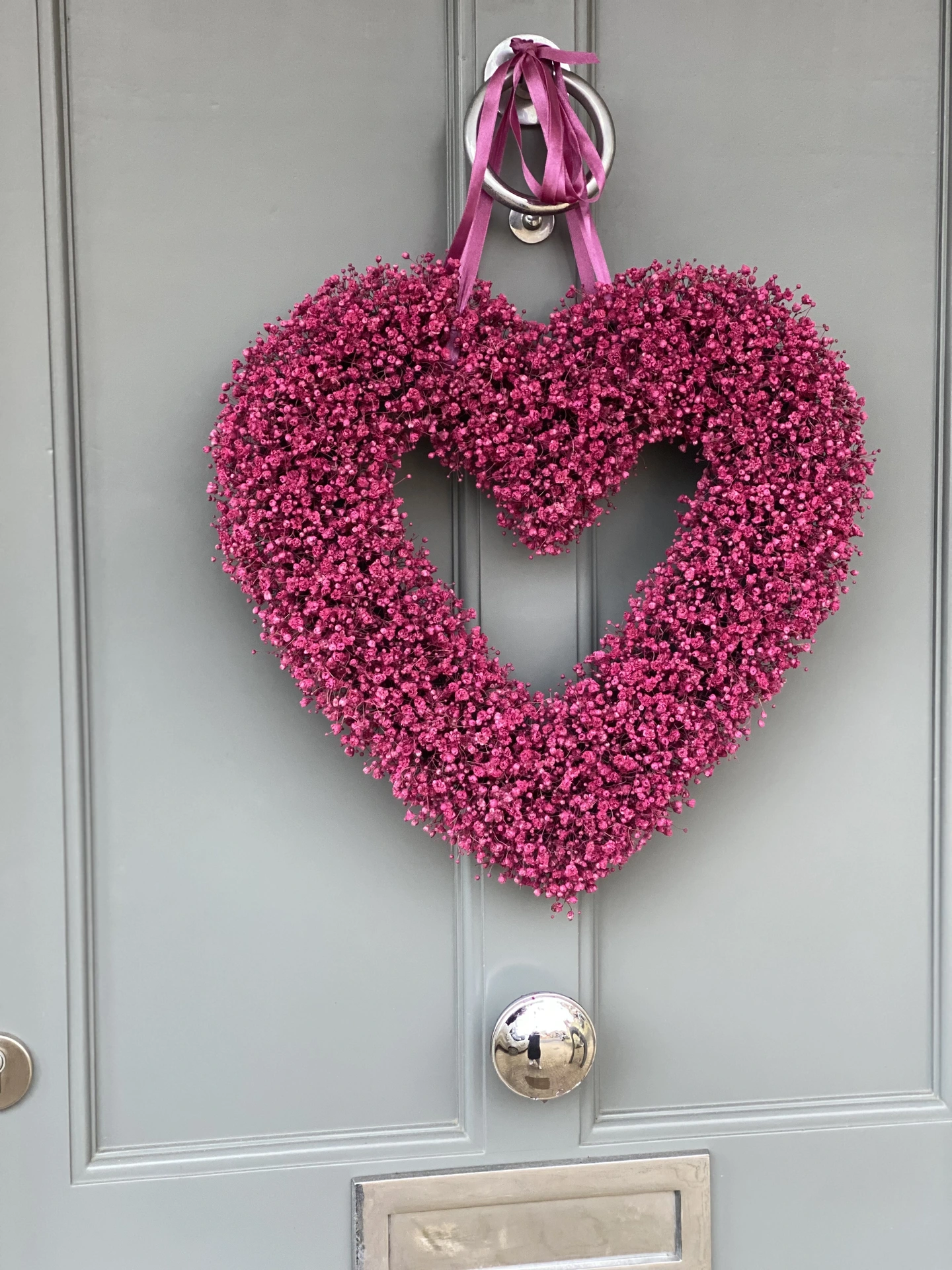 This beautiful fresh heart shaped wreath is made from bundles of coloured/ painted cerise gypsophilia. Its fresh and thriving, but after a few weeks it will start to dry out, not to panic though, it will still look gorgeous. Vibrant and stunning this wreath will be the talking point to any room or door.