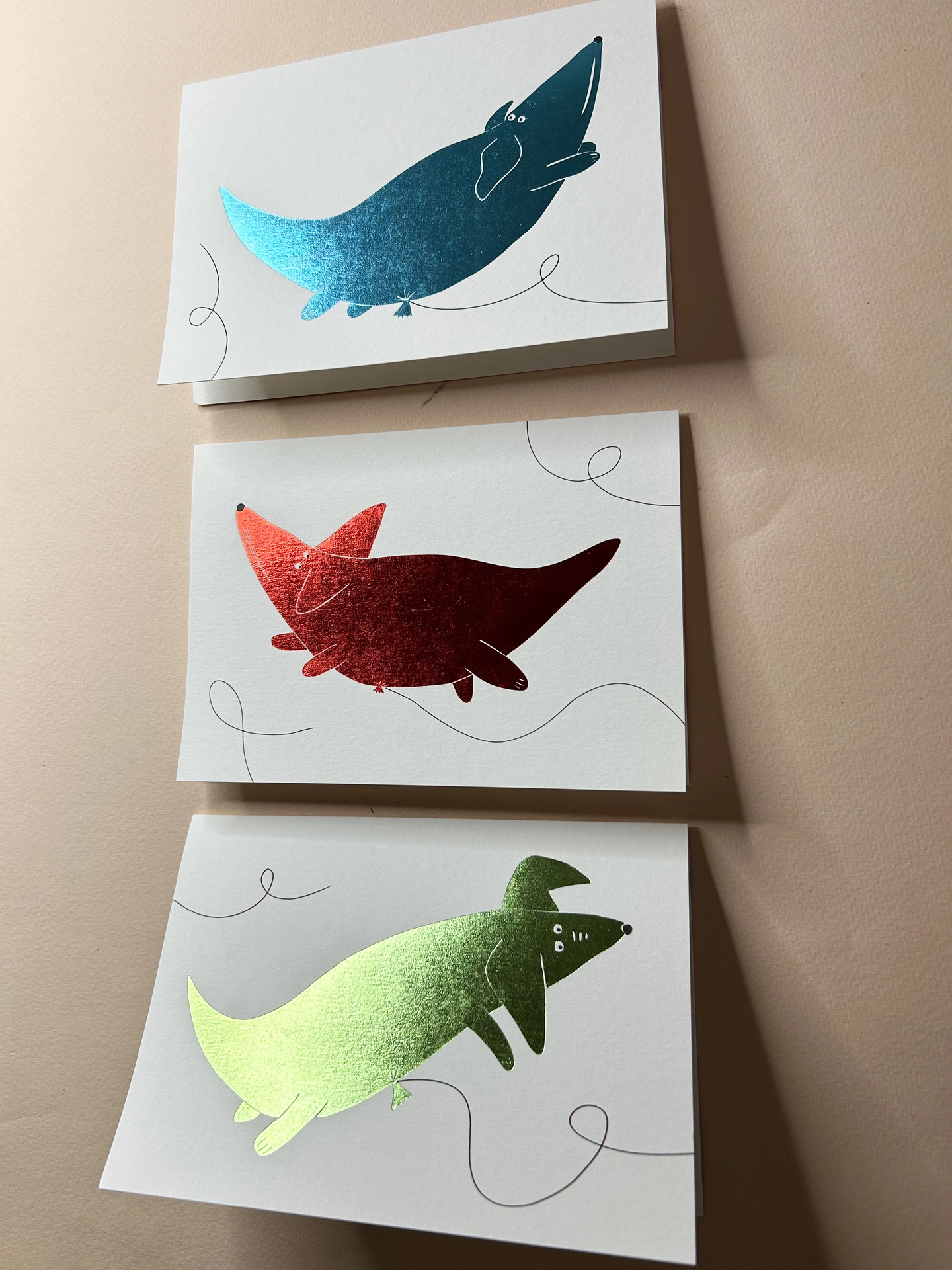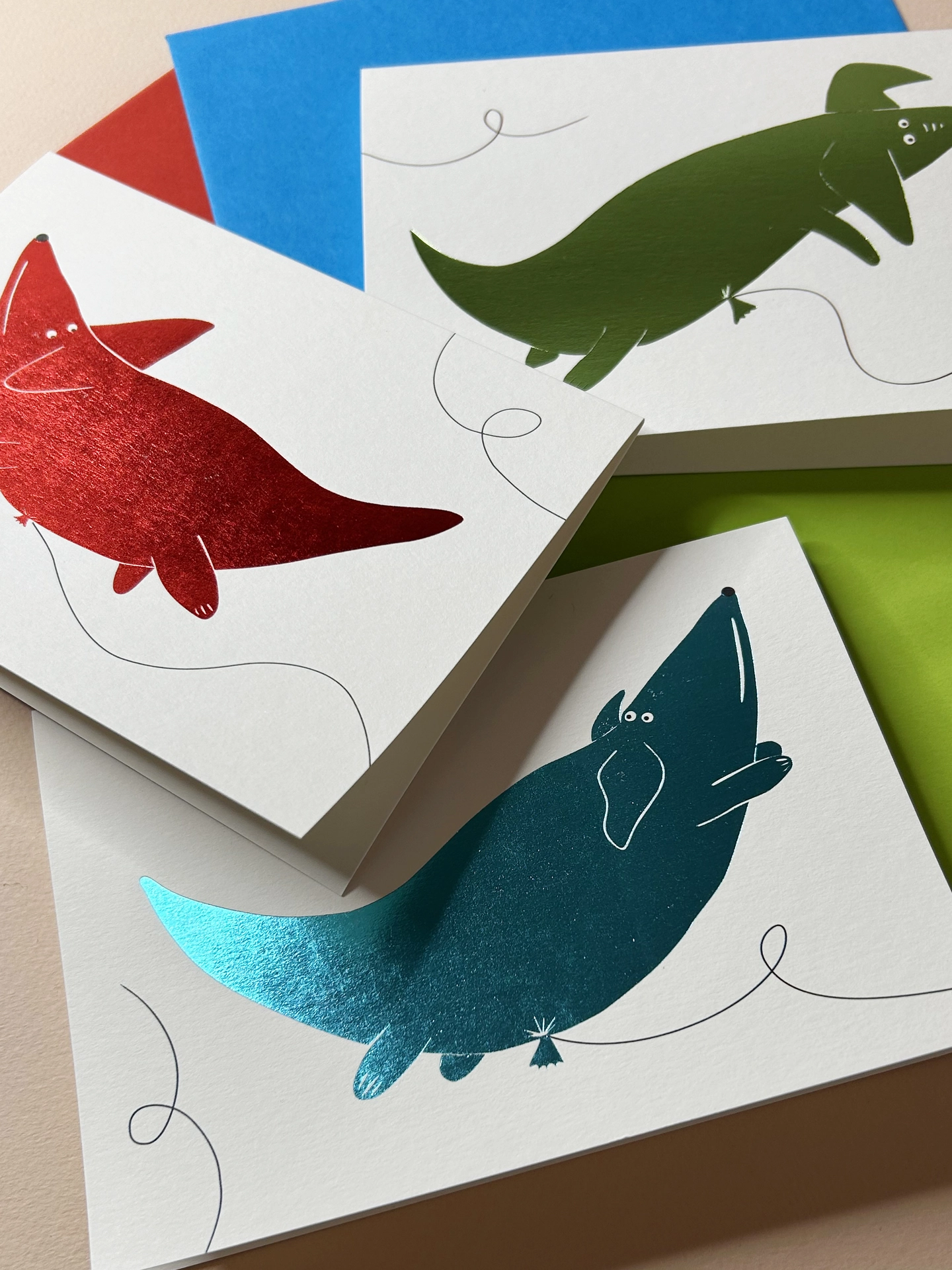 Delight in the joy of giving with this quirky helium sausage dog illustrated card, featuring a stunning red foil finish that sparkles with personality! Perfect for any occasion, this card brings a smile to everyone's face.
