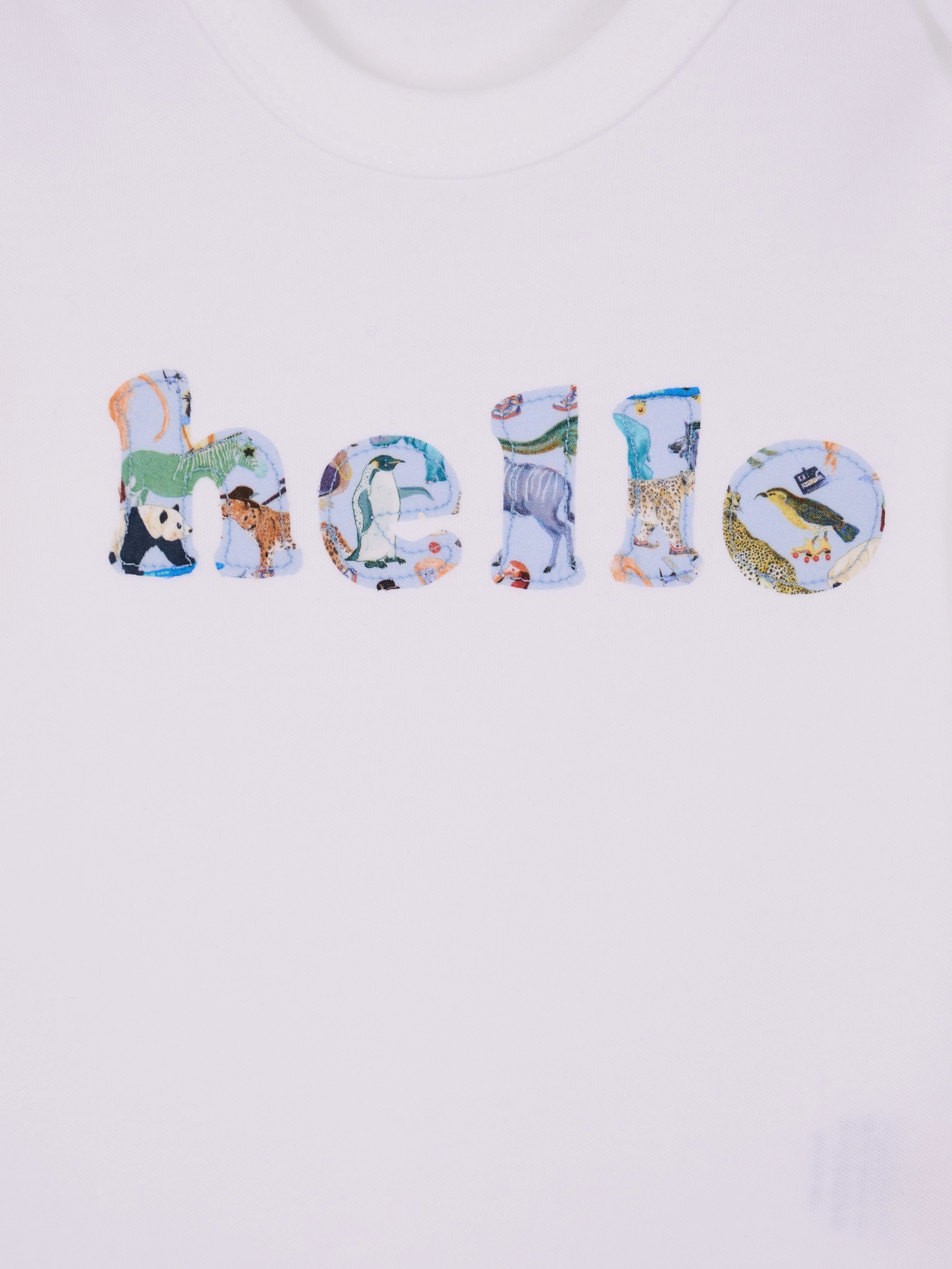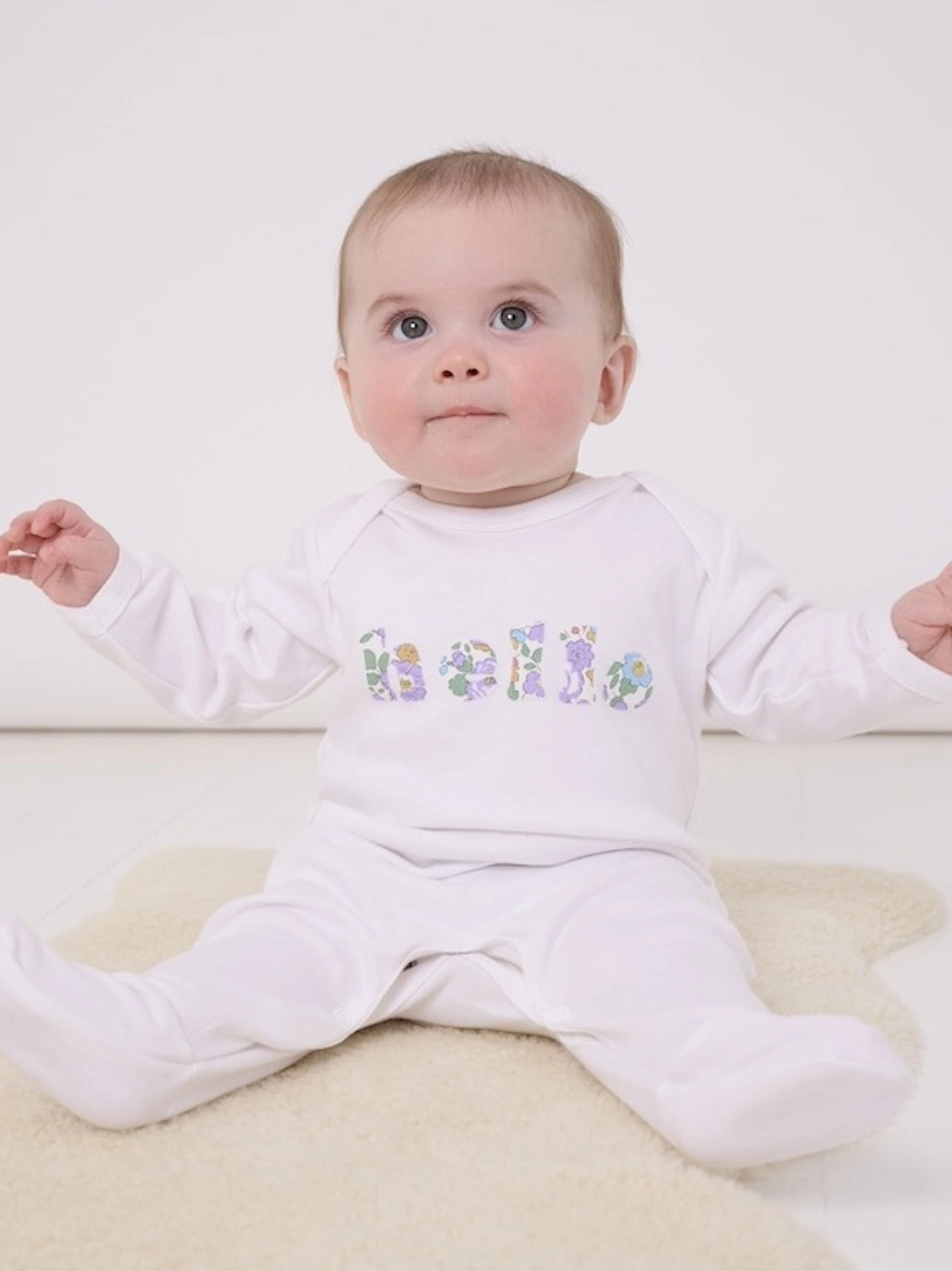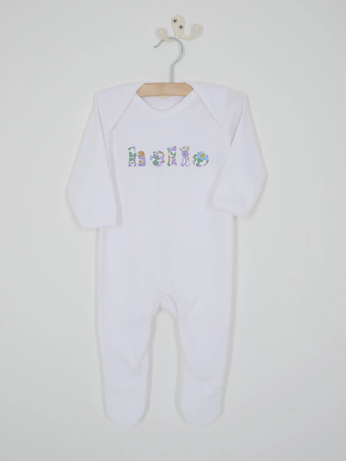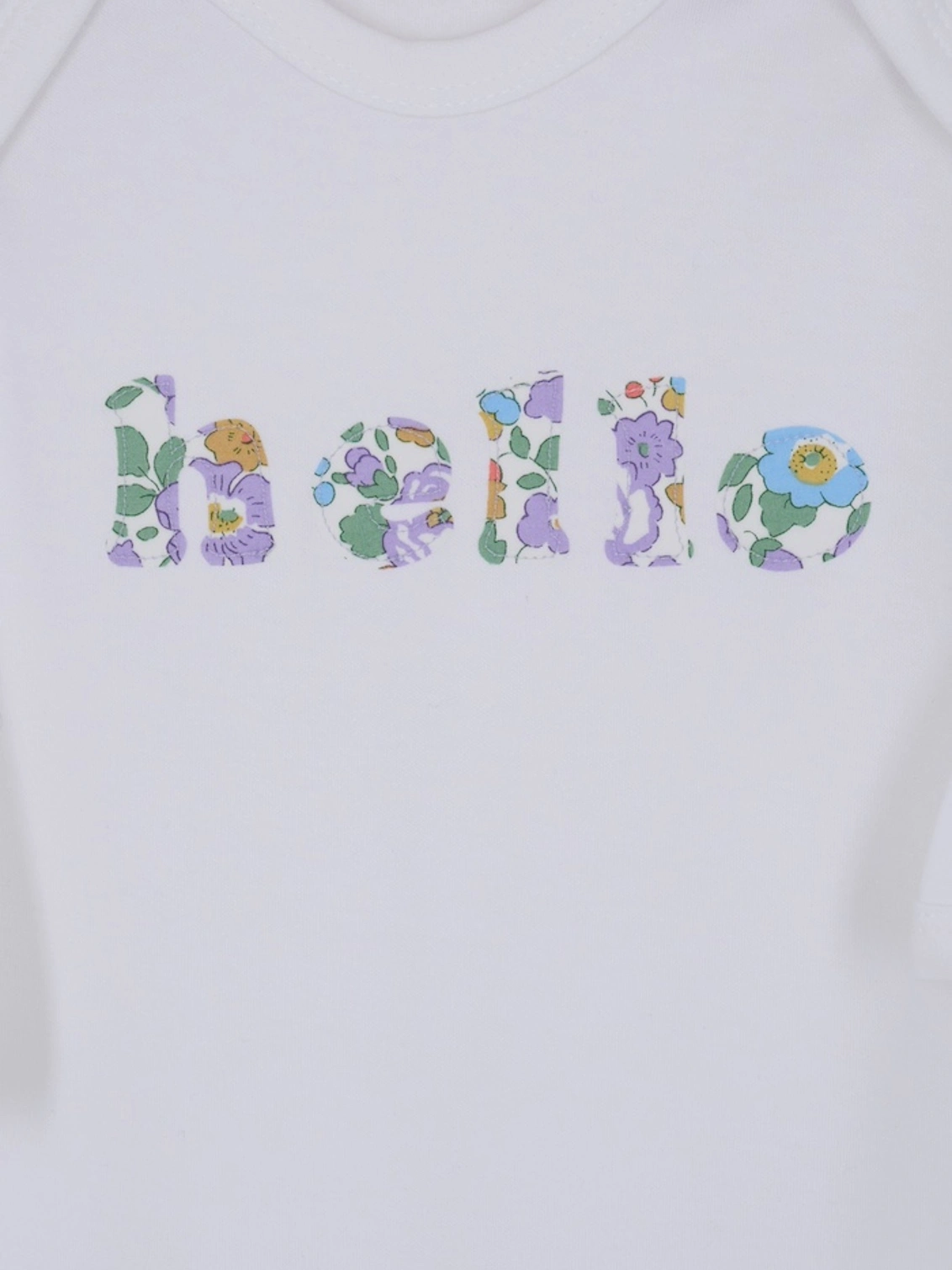 A beautifully super-soft cotton romper hand appliquéd with 'hello' in the Liberty Print Tana Lawn cotton of your choice, making it the perfect 'welcome to the world' outfit.