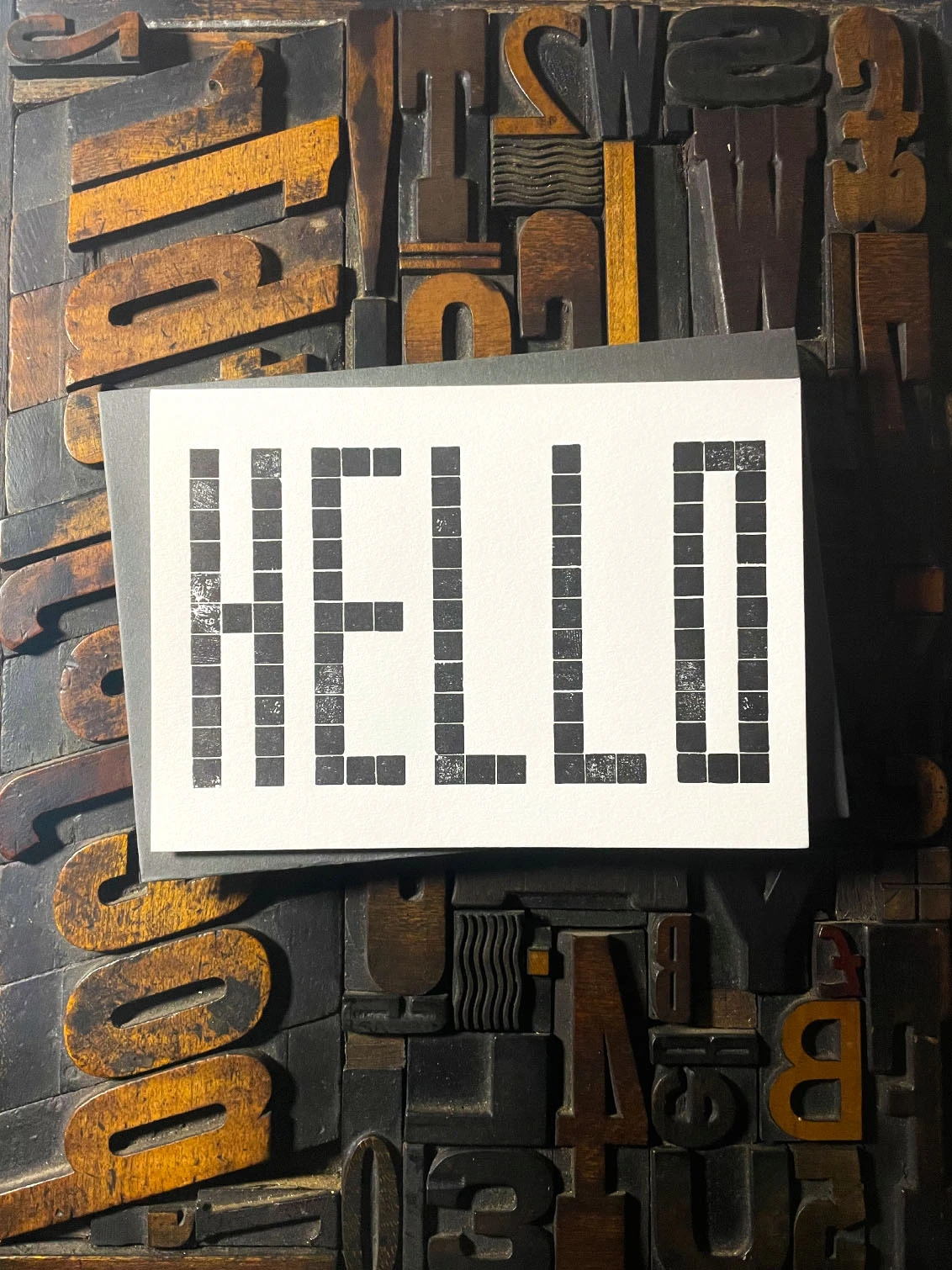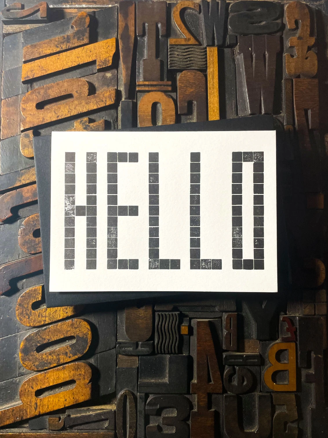 Made from a grid of square wooden blocks, these cards are printed with my own fair hands on my 1915 Arab Crown Folio Press. The card is hand-fed into the press. Printed using deep black ink with a deep impression print. Printed on the finest Colorplan Pristine White thick 350gsm double-sided card with a range of matching colours of Colorplan 135gsm self-seal envelope; recognised as one of the best double-sided coloured cards on the market, Colorplan is manufactured from 100% virgin ECF fibre.