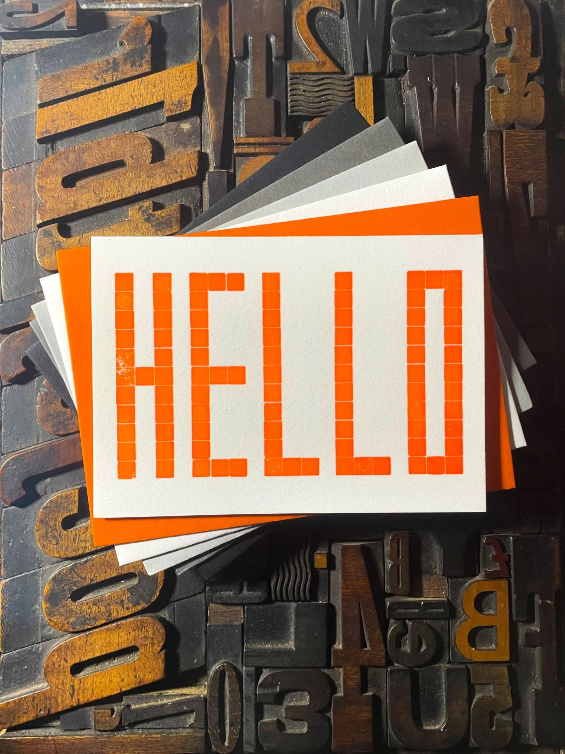 Made from a grid of square wooden blocks, these cards are printed with my own fair hands on my 1915 Arab Crown Folio Press. The card is hand-fed into the press. Printed using fluorescent orange ink with a deep impression print. Printed on the finest Colorplan Pristine White thick 350gsm double-sided card with a range of matching colours of Colorplan 135gsm self-seal envelope; recognised as one of the best double-sided coloured cards on the market, Colorplan is manufactured from 100% virgin ECF fibre.