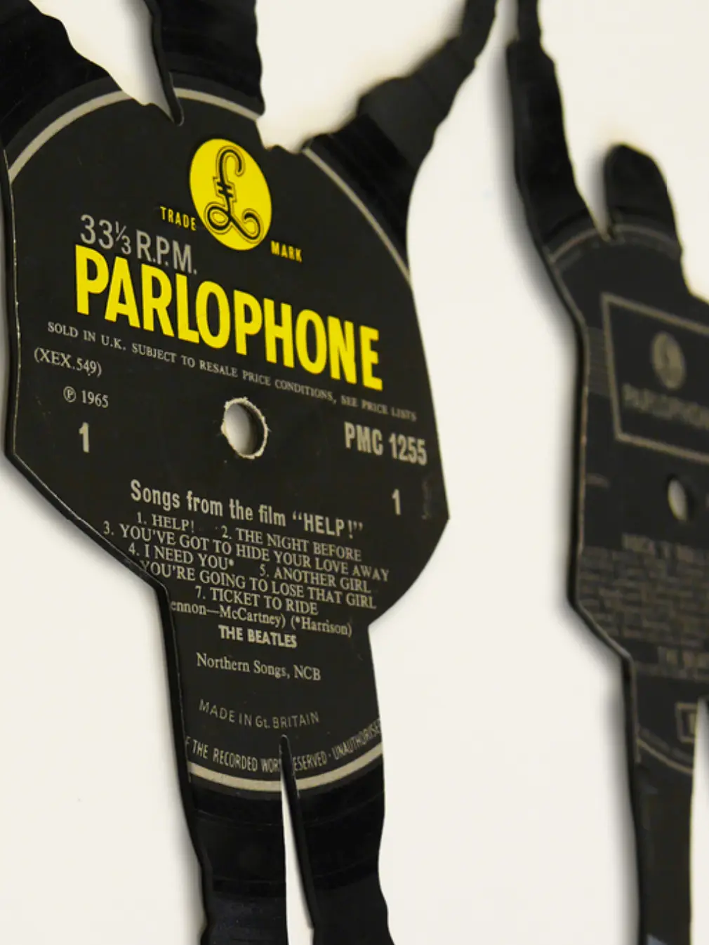 A recreation of the iconic Help image recreated in original Beatles vinyl records.