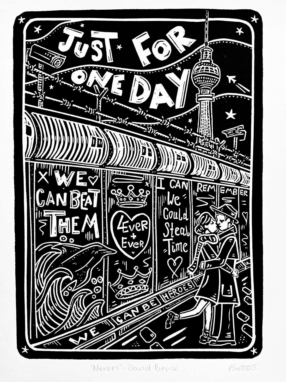 Original linocut print inspired by lyrics from the song 'Heroes' by David Bowie, from his 12th studio album 'Heroes' from 1977.